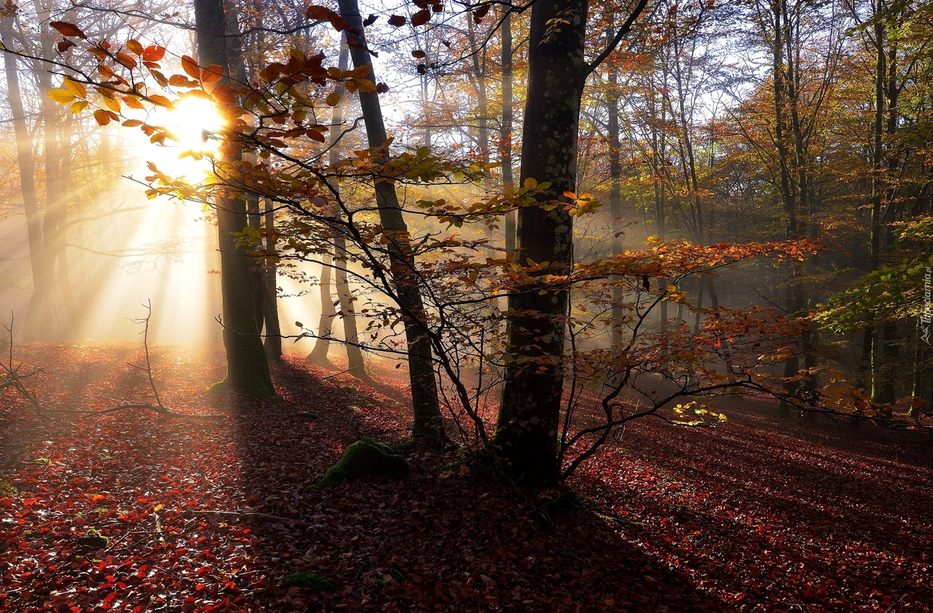 Edytor tapety: Promienie słoneczne między gałązkami drzew w lesie
