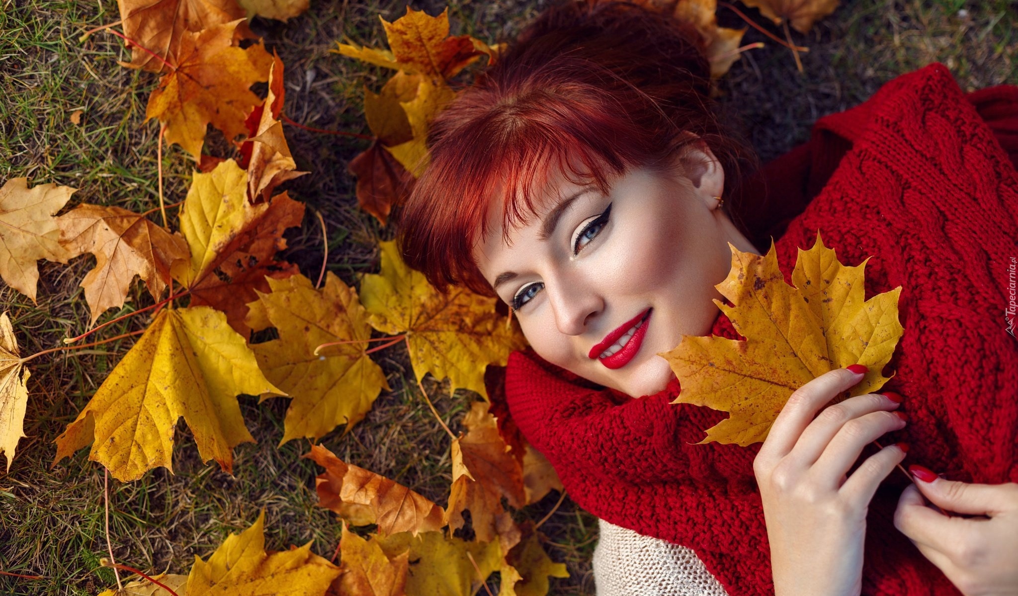 Edytor tapety: Uśmiechnięta kobieta z liściem w dłoniach