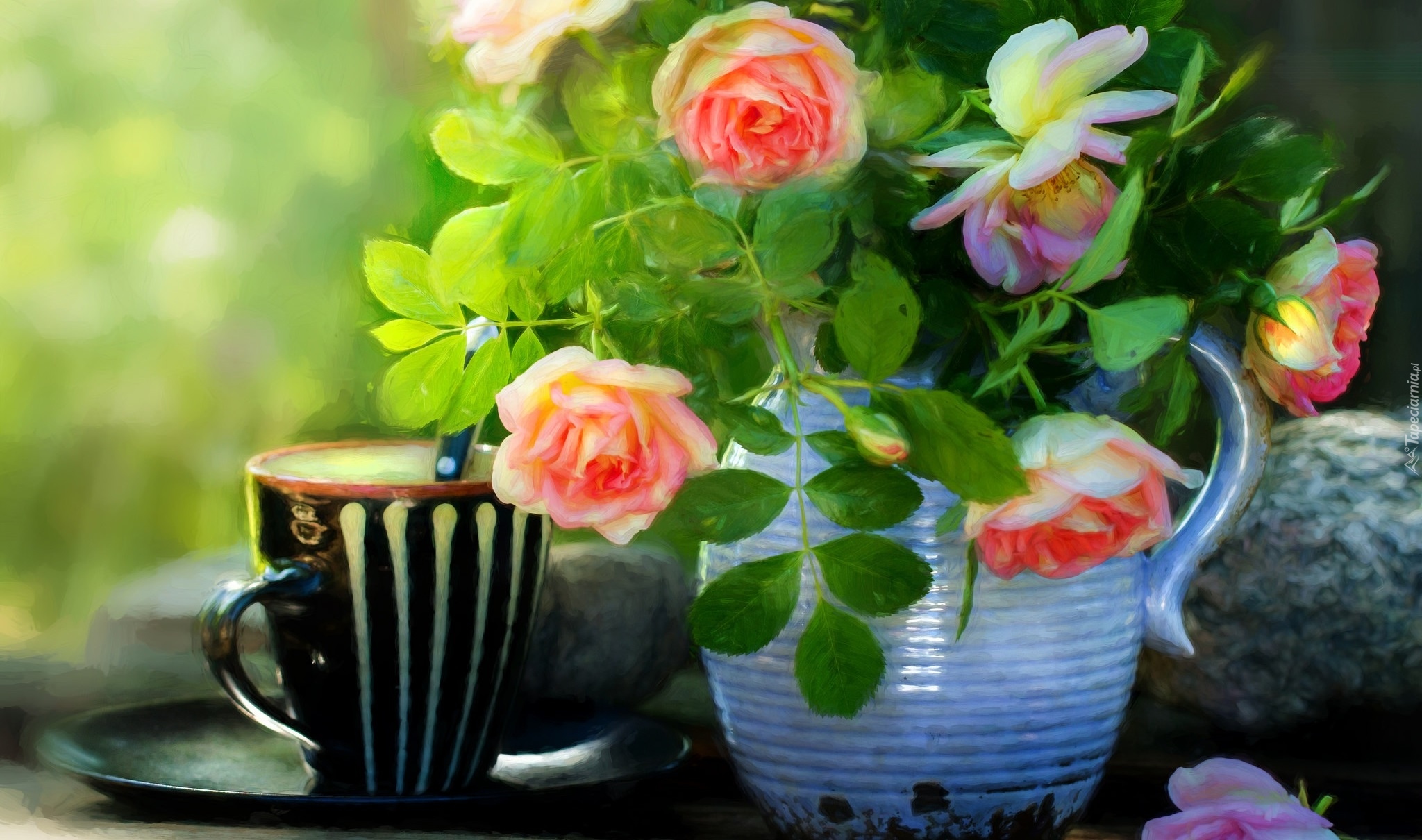 Edytor tapety: Bukiet róż w dzbanku na obrazie