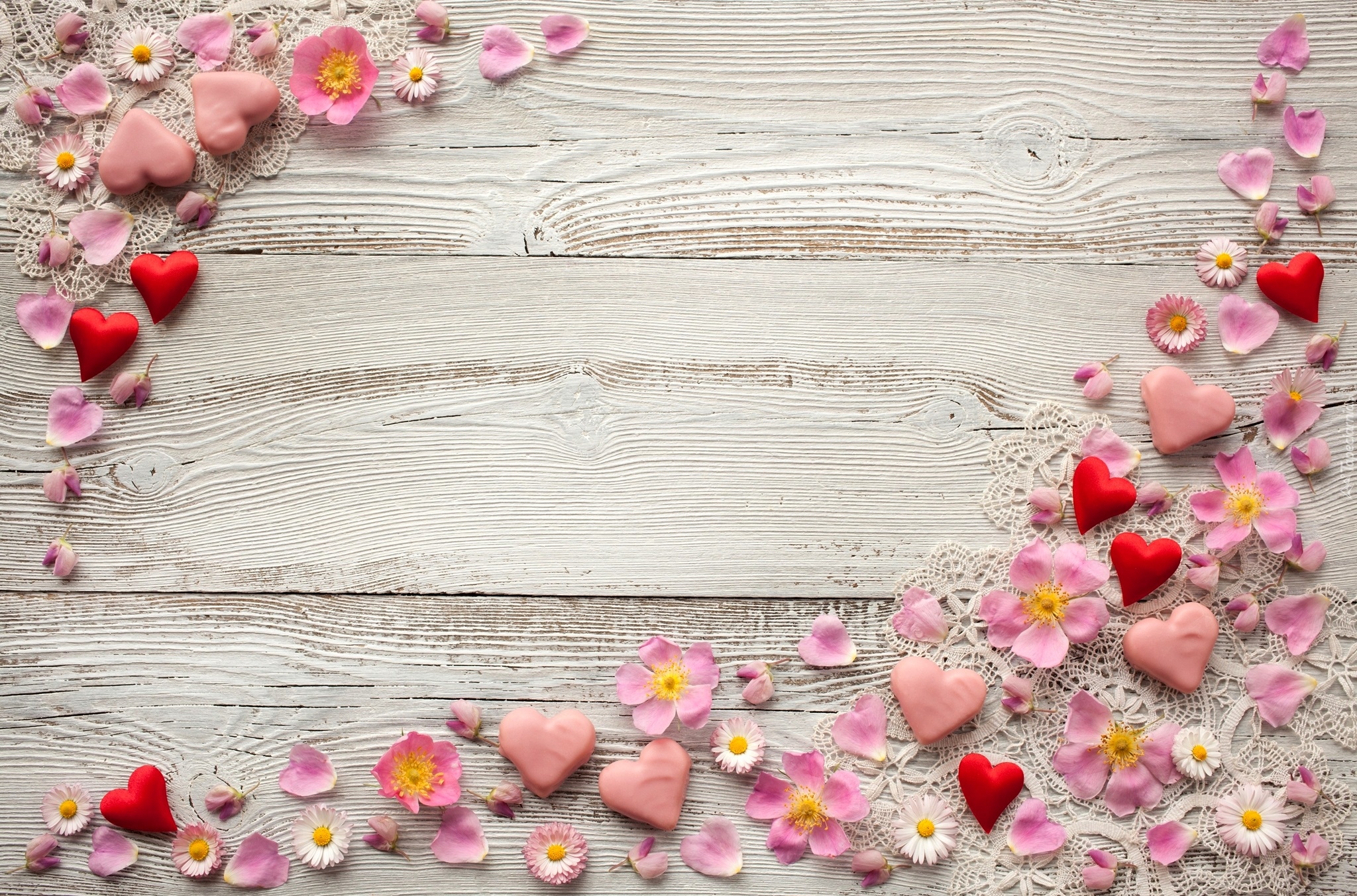Edytor tapety: Kolorowe serduszka i kwiatki na desce