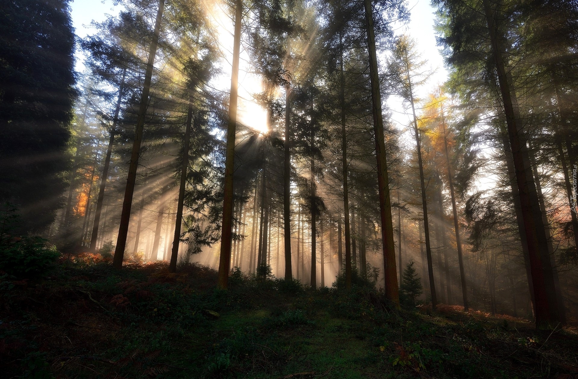 Edytor tapety: Promienie słoneczne między leśnymi drzewami