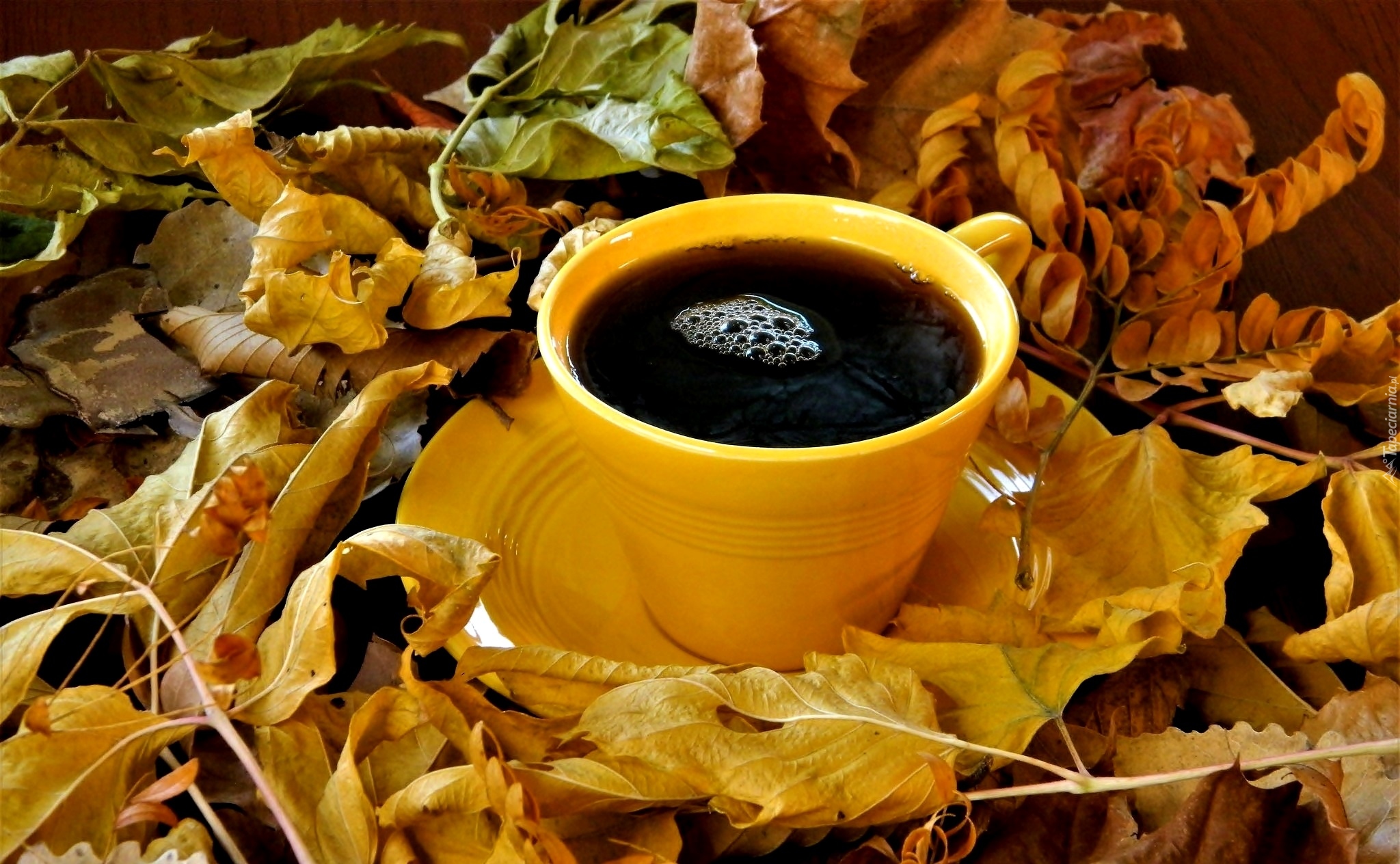 Edytor tapety: Filiżanka kawy w jesiennych liściach