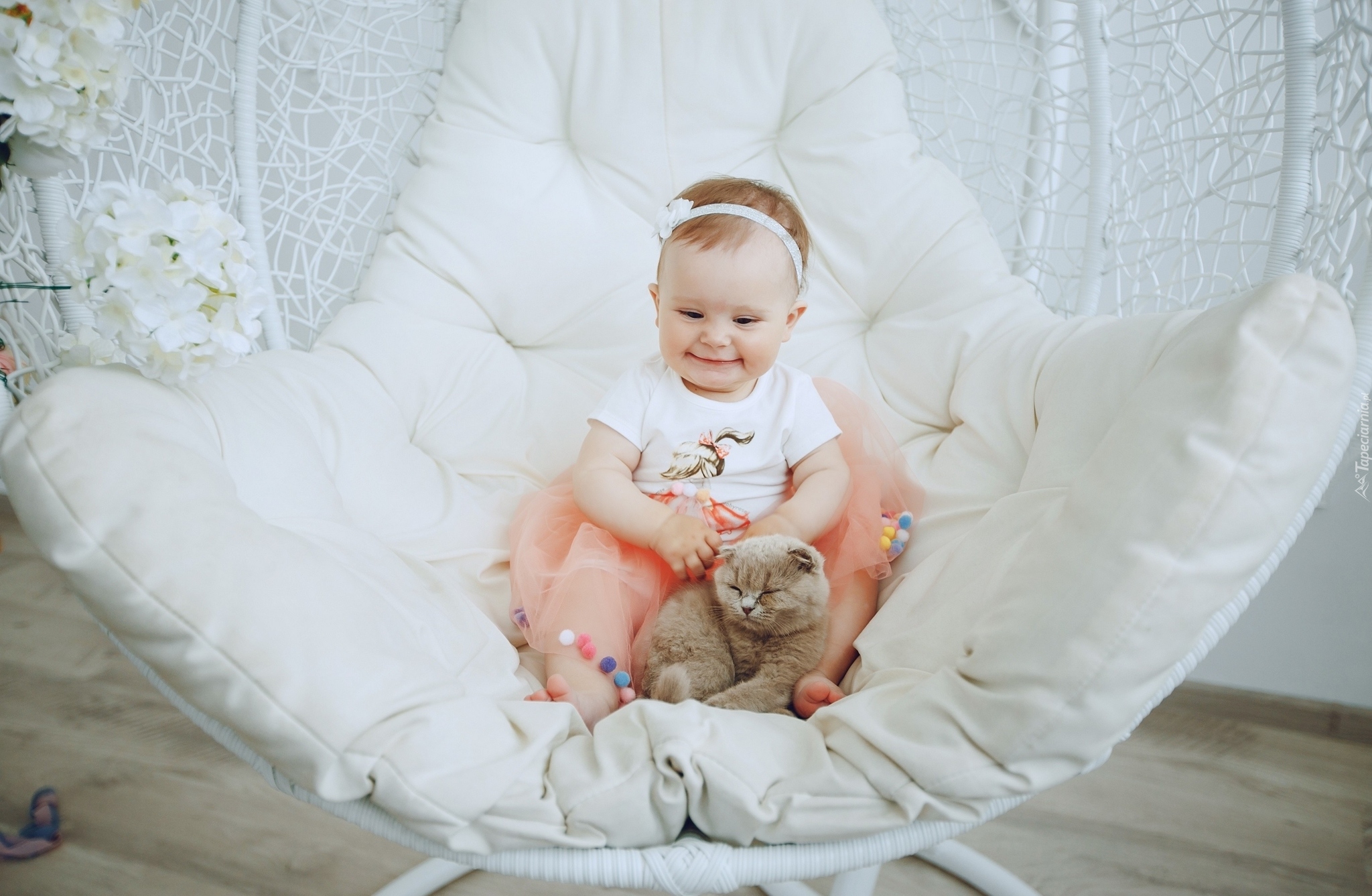 Edytor tapety: Uśmiechnięta dziewczynka z kotem brytyjskim na fotelu