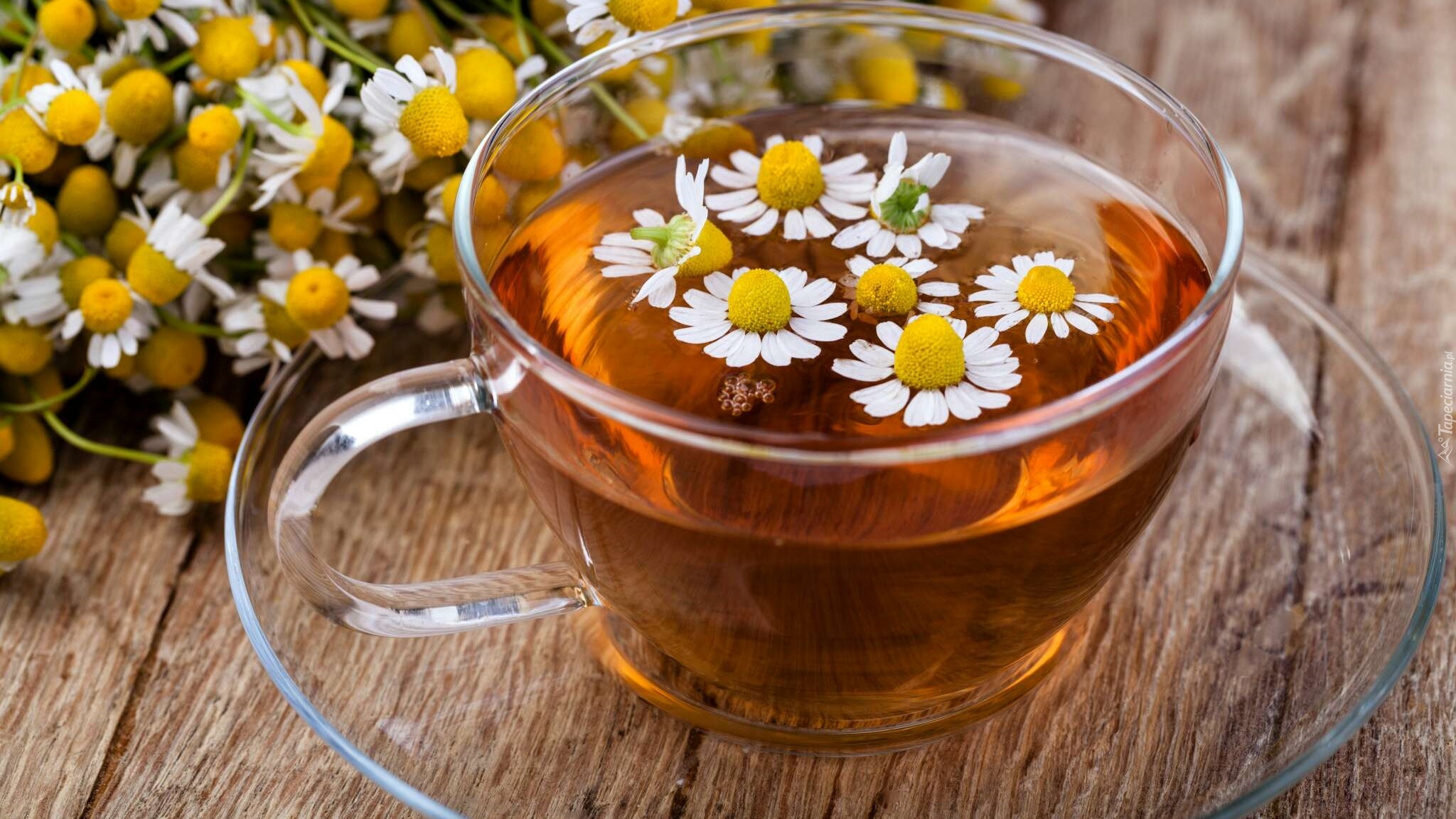 Edytor tapety: Kwiaty rumianku w herbacie i obok na deskach