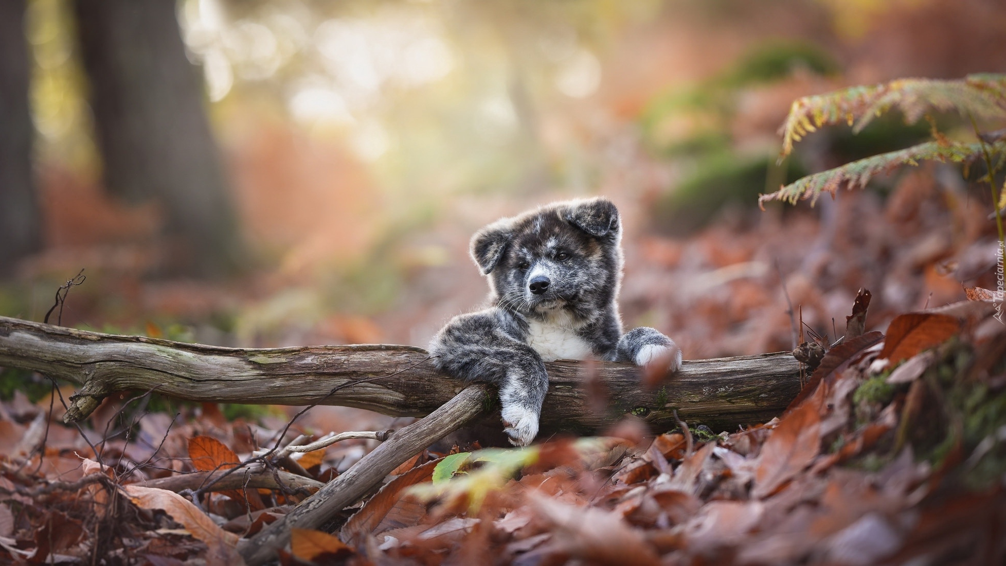 Edytor tapety: Szczeniak akita inu oparty o leżący konar