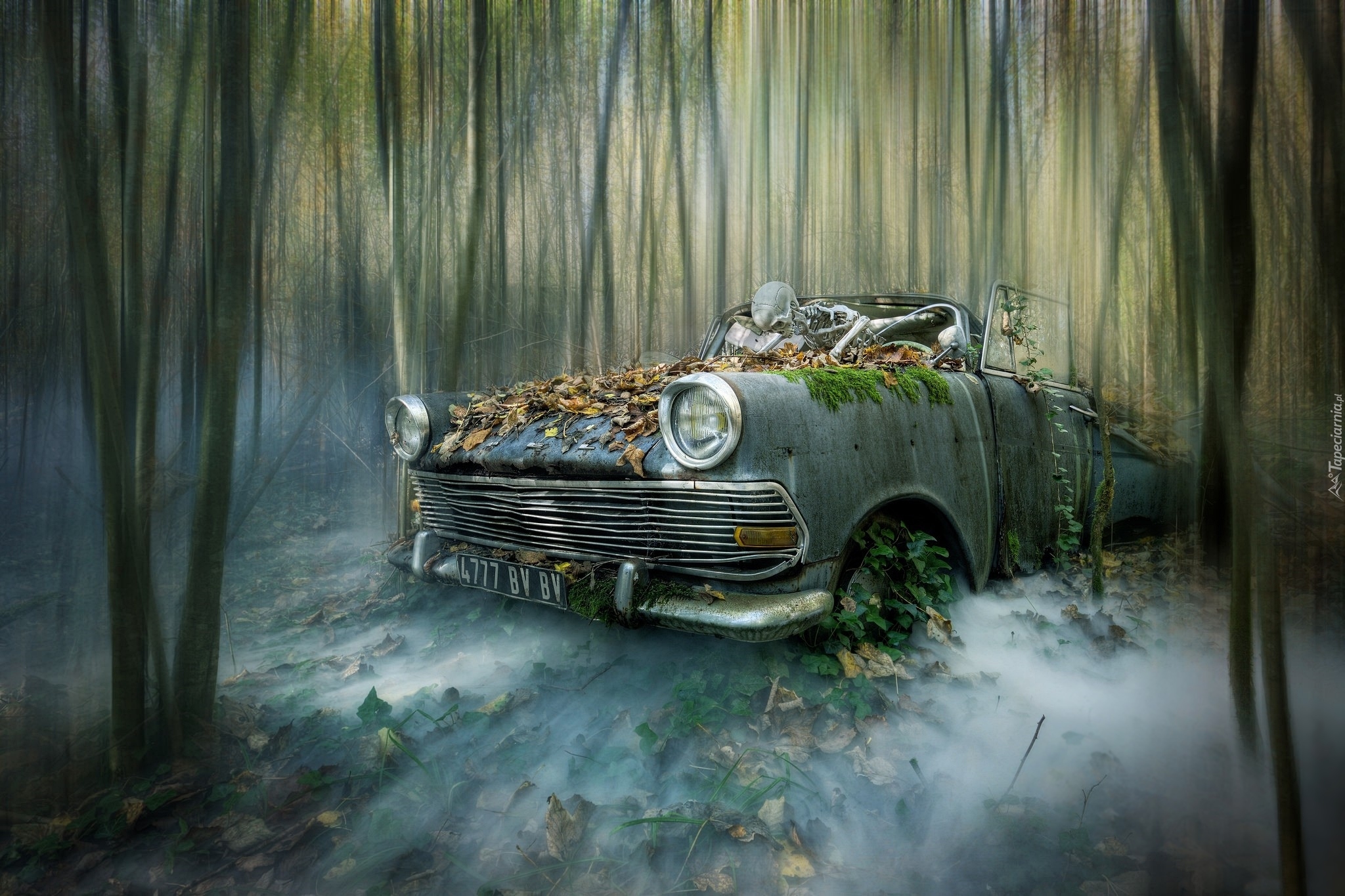 Edytor tapety: Szkielet we wraku samochodu w zamglonym lesie