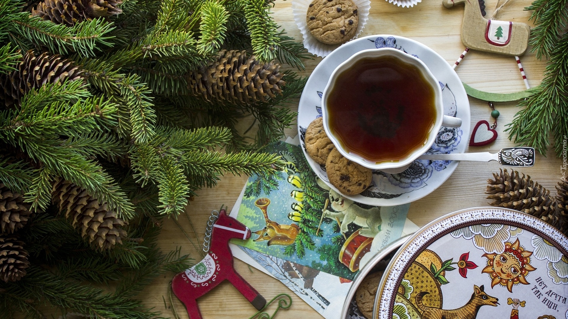 Edytor tapety: Herbata w filiżance i ciasteczka obok świerkowych gałązek