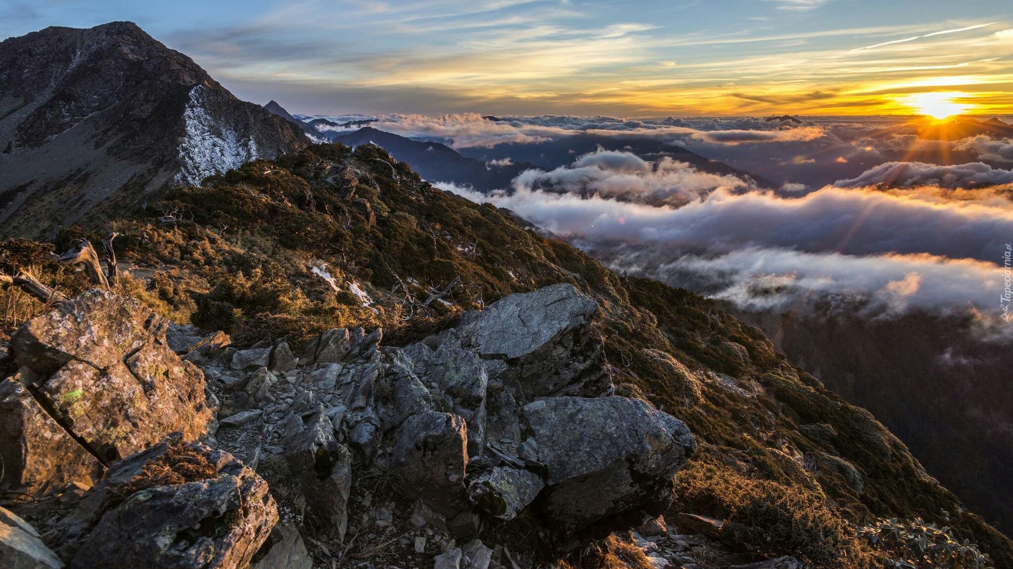 Edytor tapety: Promienie zachodzącego słońca nad zamglonymi górami