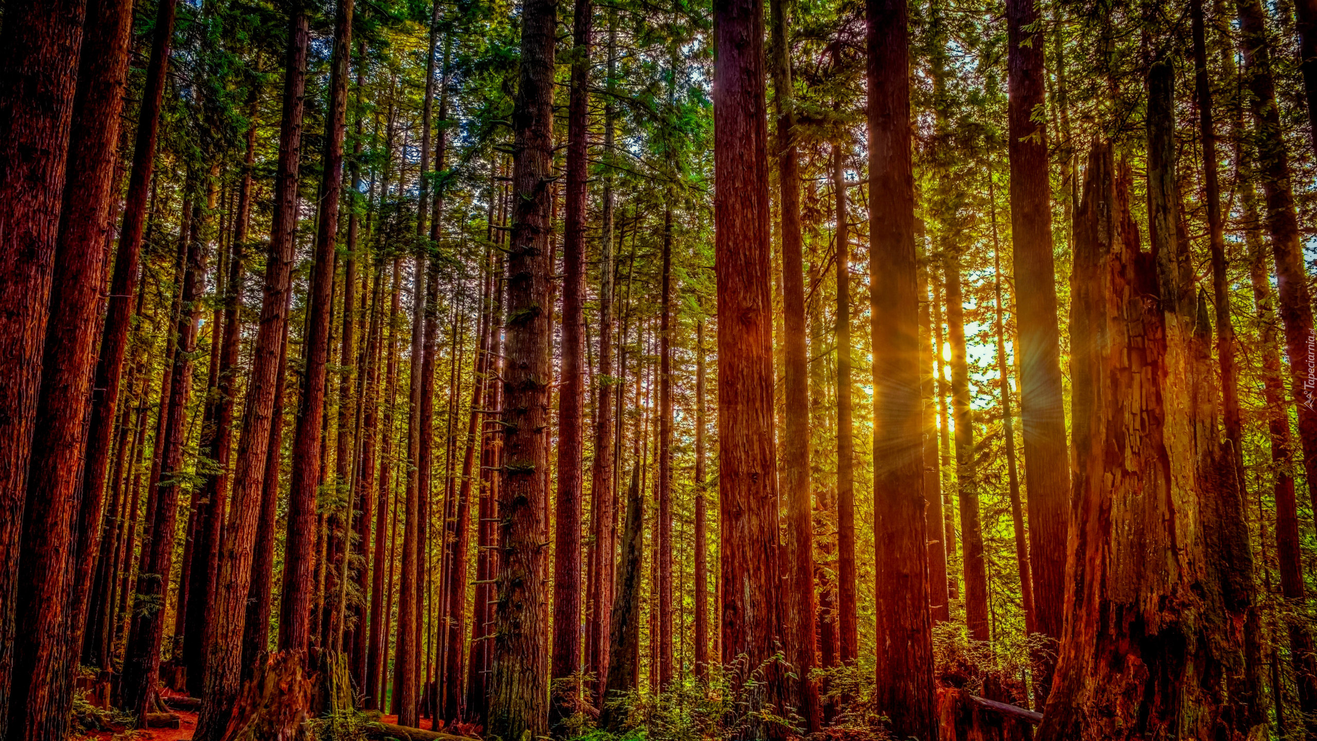 Edytor tapety: Promienie słońca między drzewami w Parku Narodowym Redwood