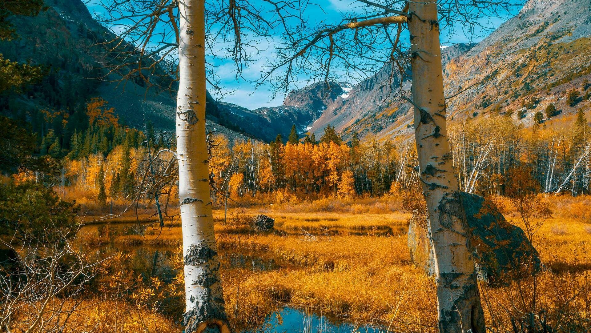 Edytor tapety: Dwie brzozy na tle jesiennych gór