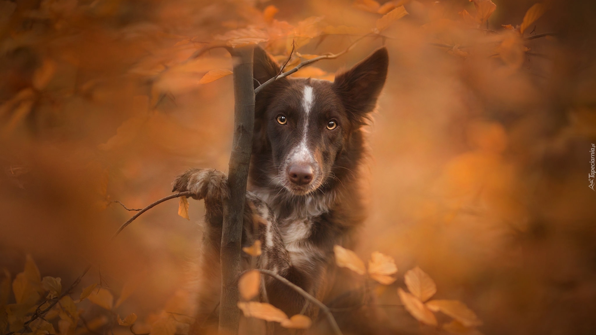 Edytor tapety: Border collie i drzewko z jesiennymi liśćmi