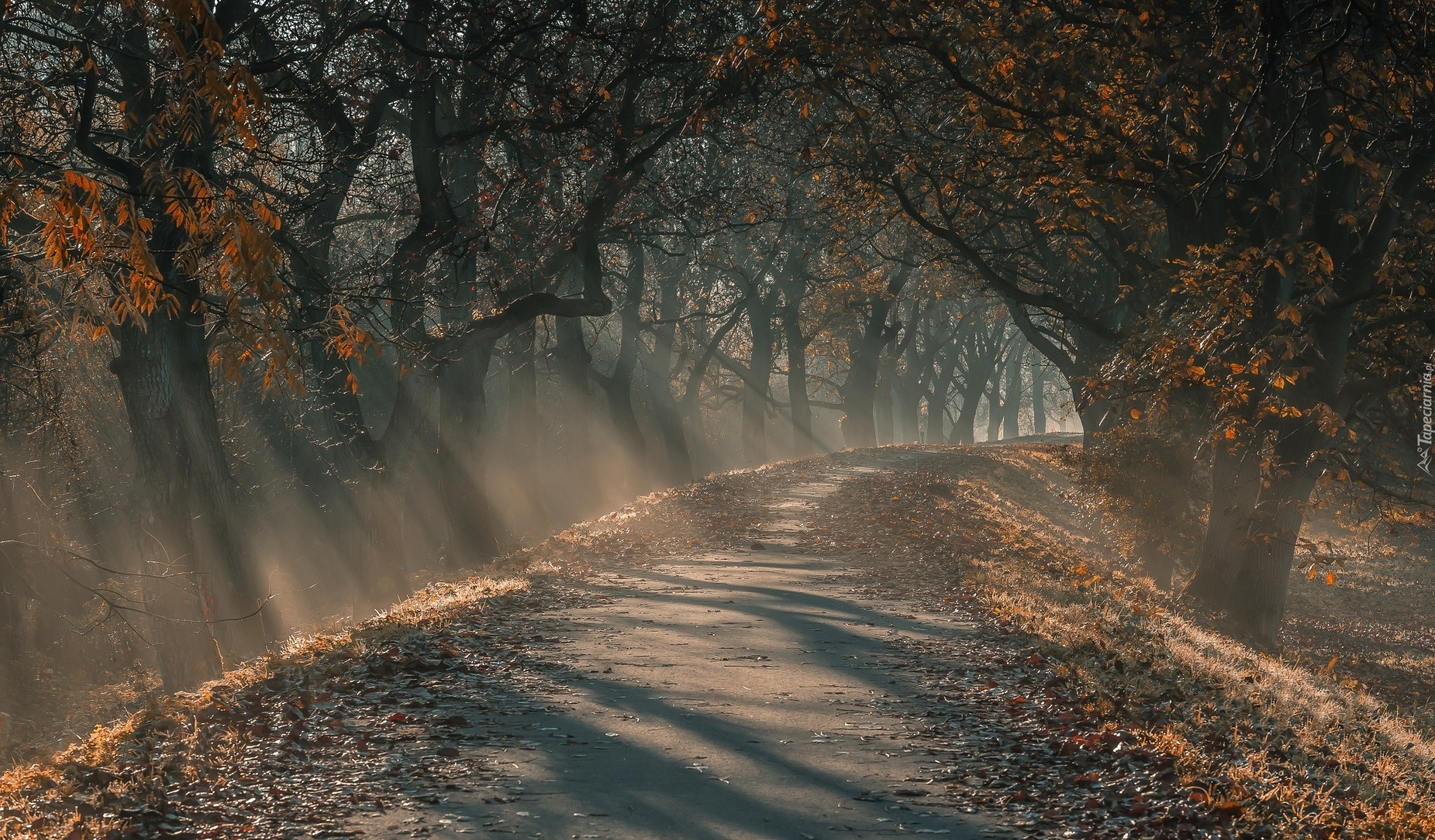 Edytor tapety: Jesienne zamglone drzewa przy drodze