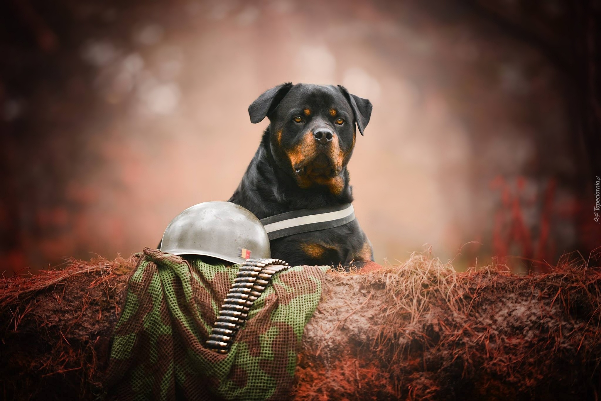 Edytor tapety: Rottweiler obok hełmu i naboi