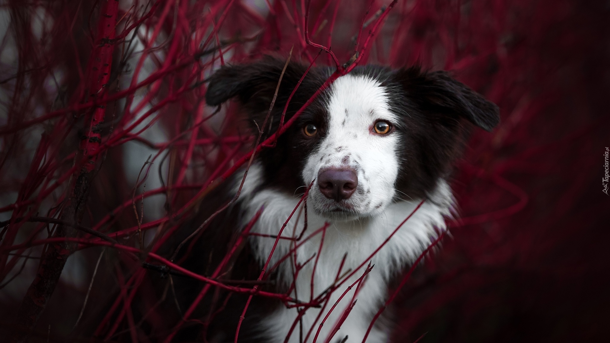 Edytor tapety: Border collie wygląda zza gałązek