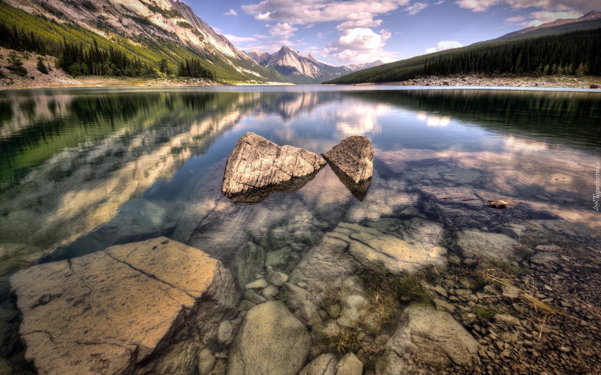 Edytor tapety: Góry i chmury odbijają się w jeziorze