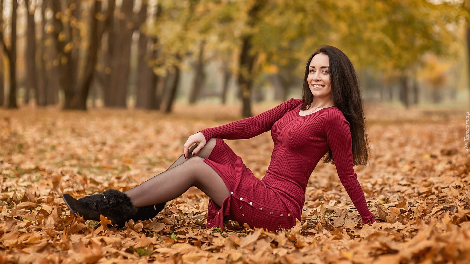Edytor tapety: Kobieta w sukience siedząca na jesiennych liściach
