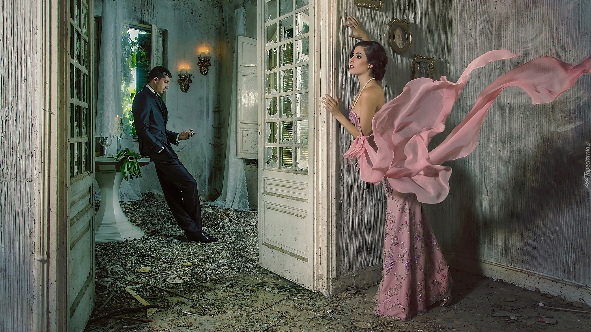 Edytor tapety: Mężczyzna w garniturze i kobieta w różowej sukni