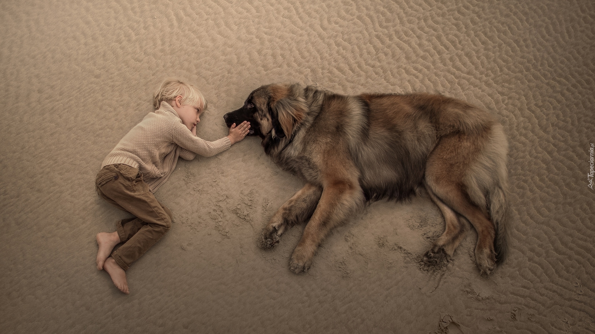 Edytor tapety: Chłopiec i leonberger leżą na piasku