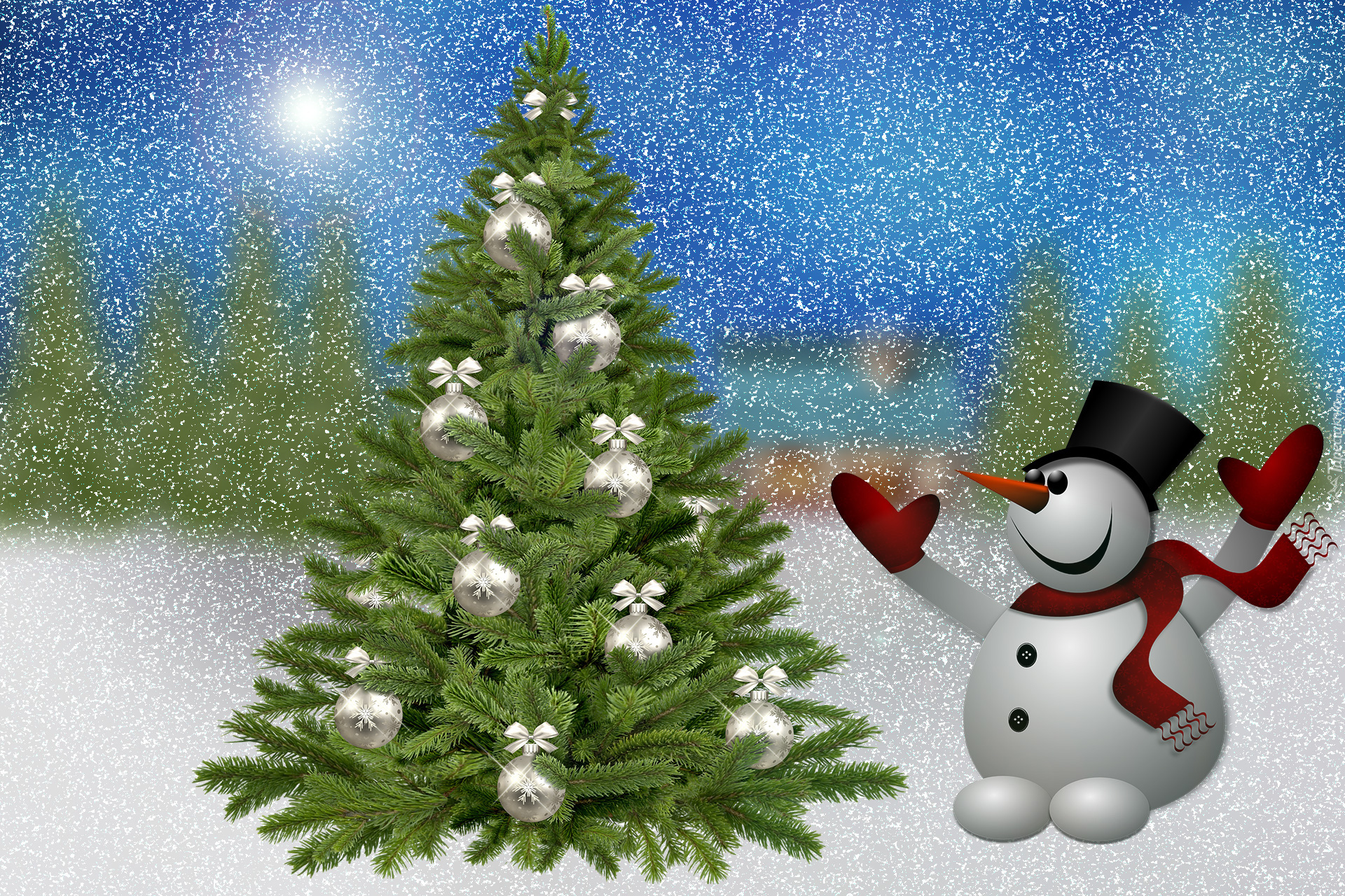 Edytor tapety: Bałwan obok choinki na śniegu w grafice