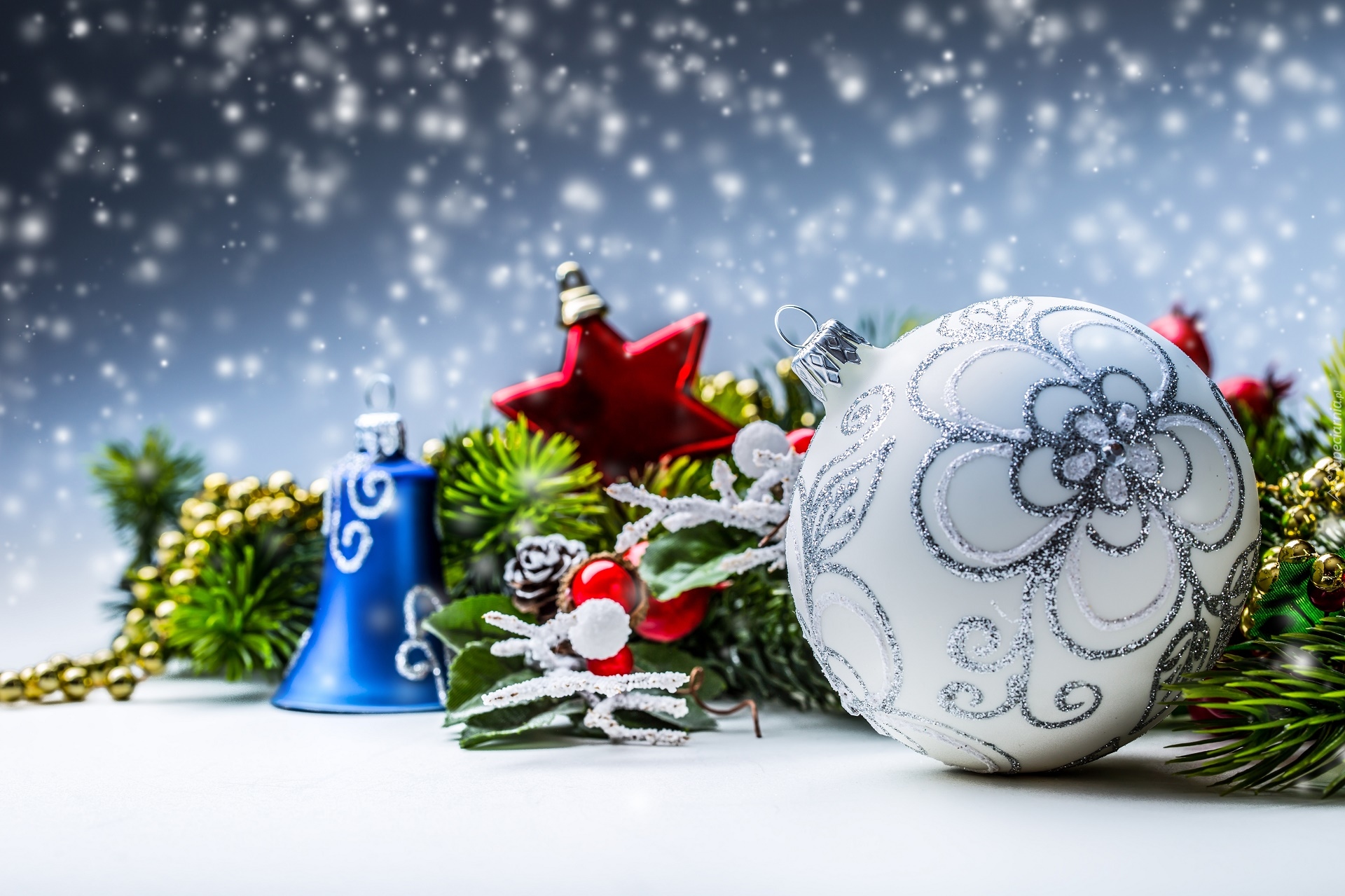 Edytor tapety: Świąteczna dekoracja z bombkami i gałązkami świerku