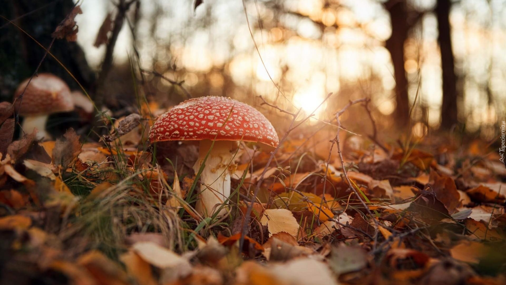 Edytor tapety: Muchomor ukrywający się w leśnej ściółce