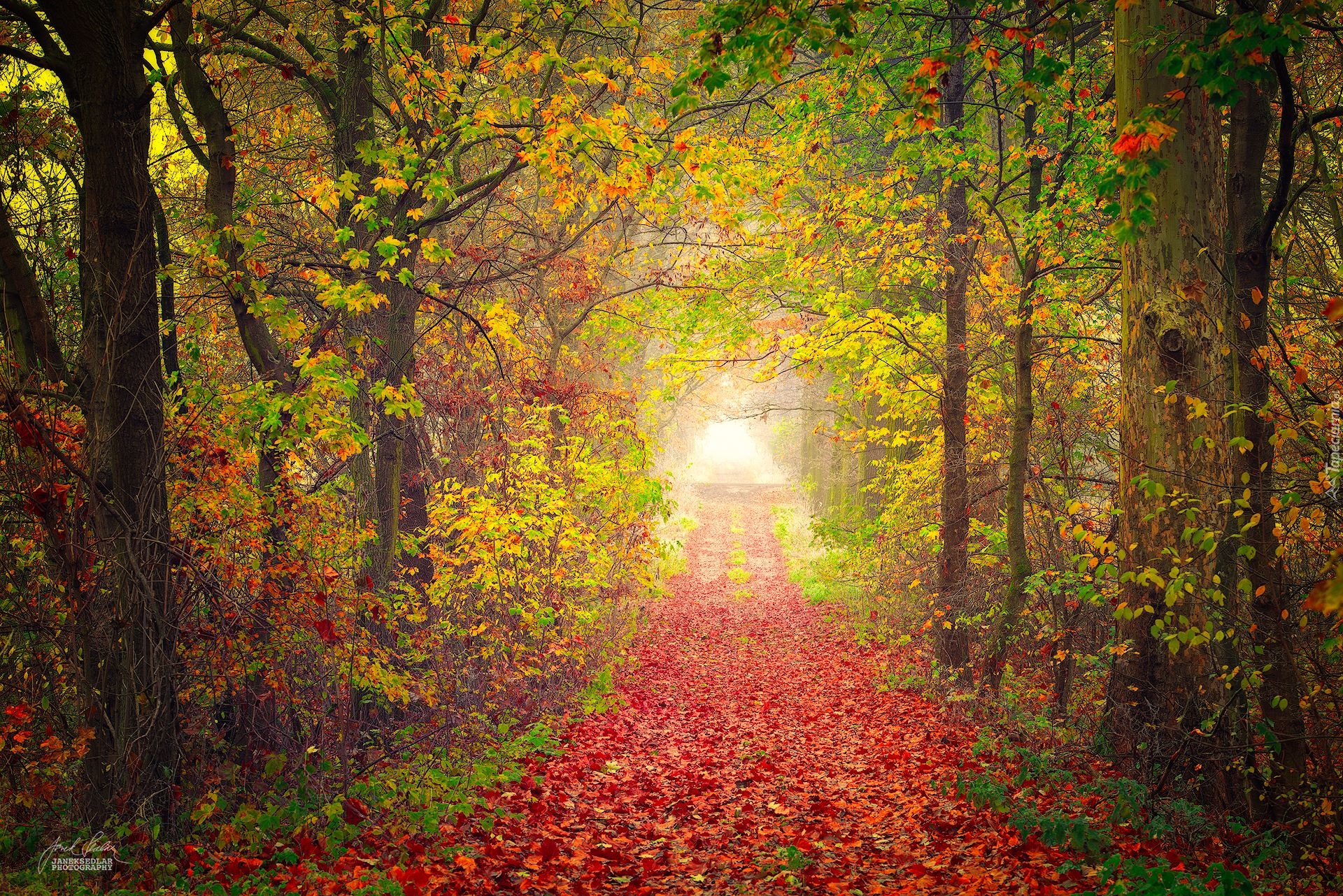 Edytor tapety: Jesienna dróżka przez las usłana liśćmi