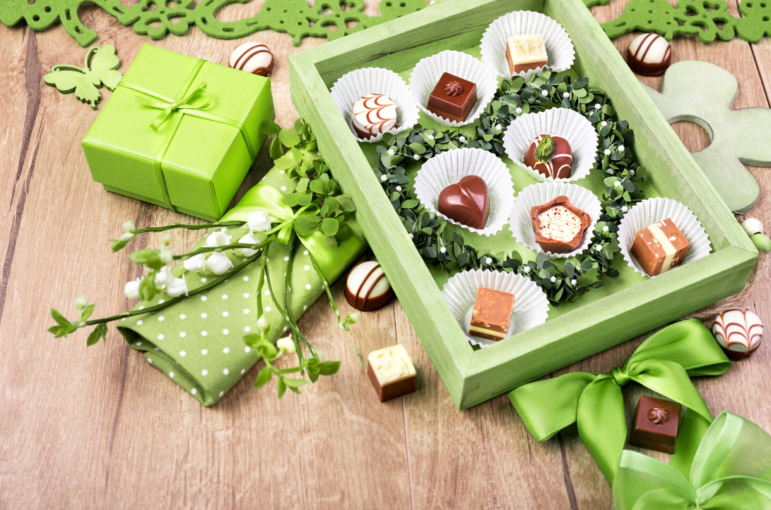 Edytor tapety: Pralinki w drewnianym pudełku i prezent