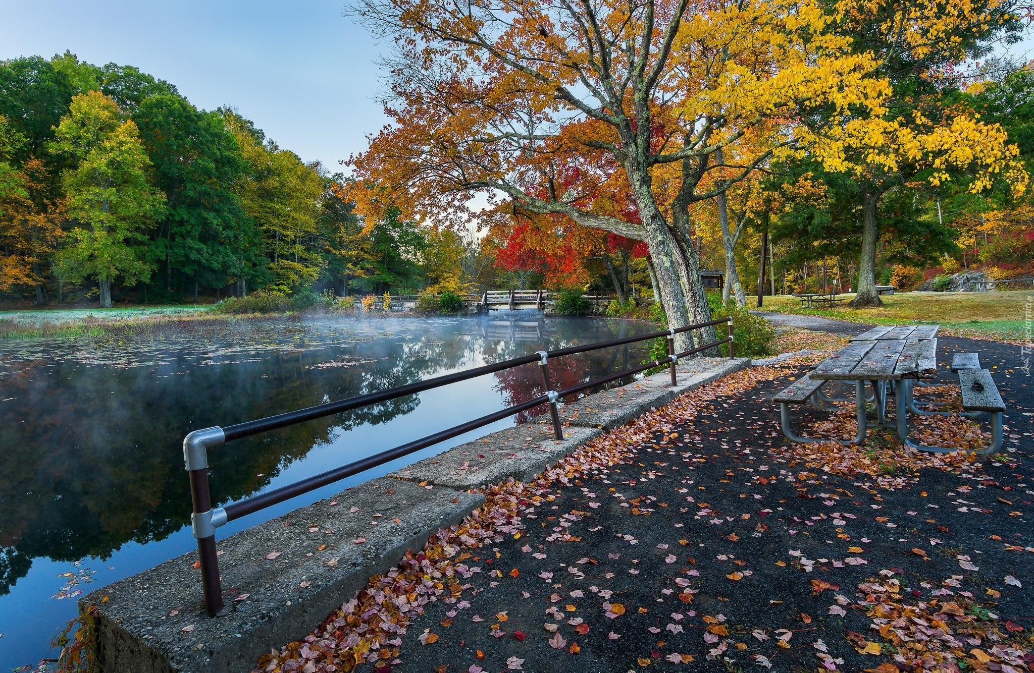 Edytor tapety: Ławki i stolik przy ogrodzeniu parkowego stawu