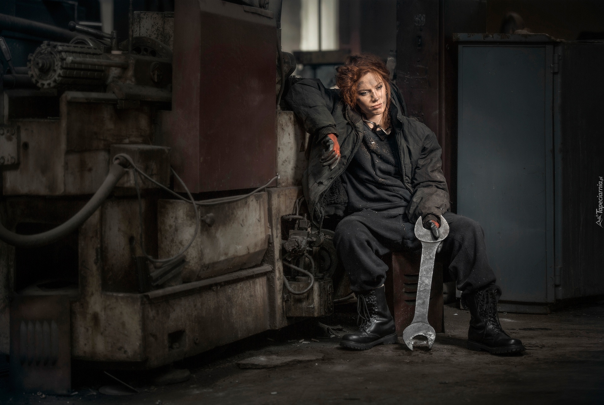 Edytor tapety: Zmęczona ubrudzona kobieta z olbrzymim kluczem