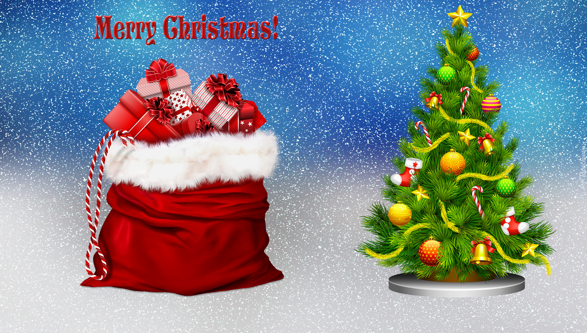 Edytor tapety: Worek z prezentami obok choinki w grafice 2D