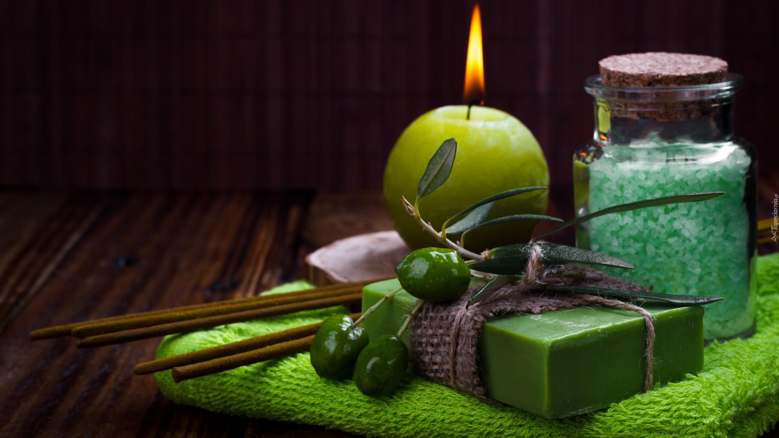 Edytor tapety: Świeczka obok mydła i soli kąpielowej w słoiku