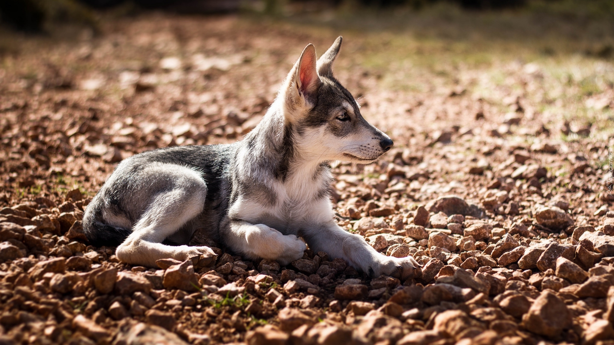 Edytor tapety: Wilczak czechosłowacki leżący na kamieniach