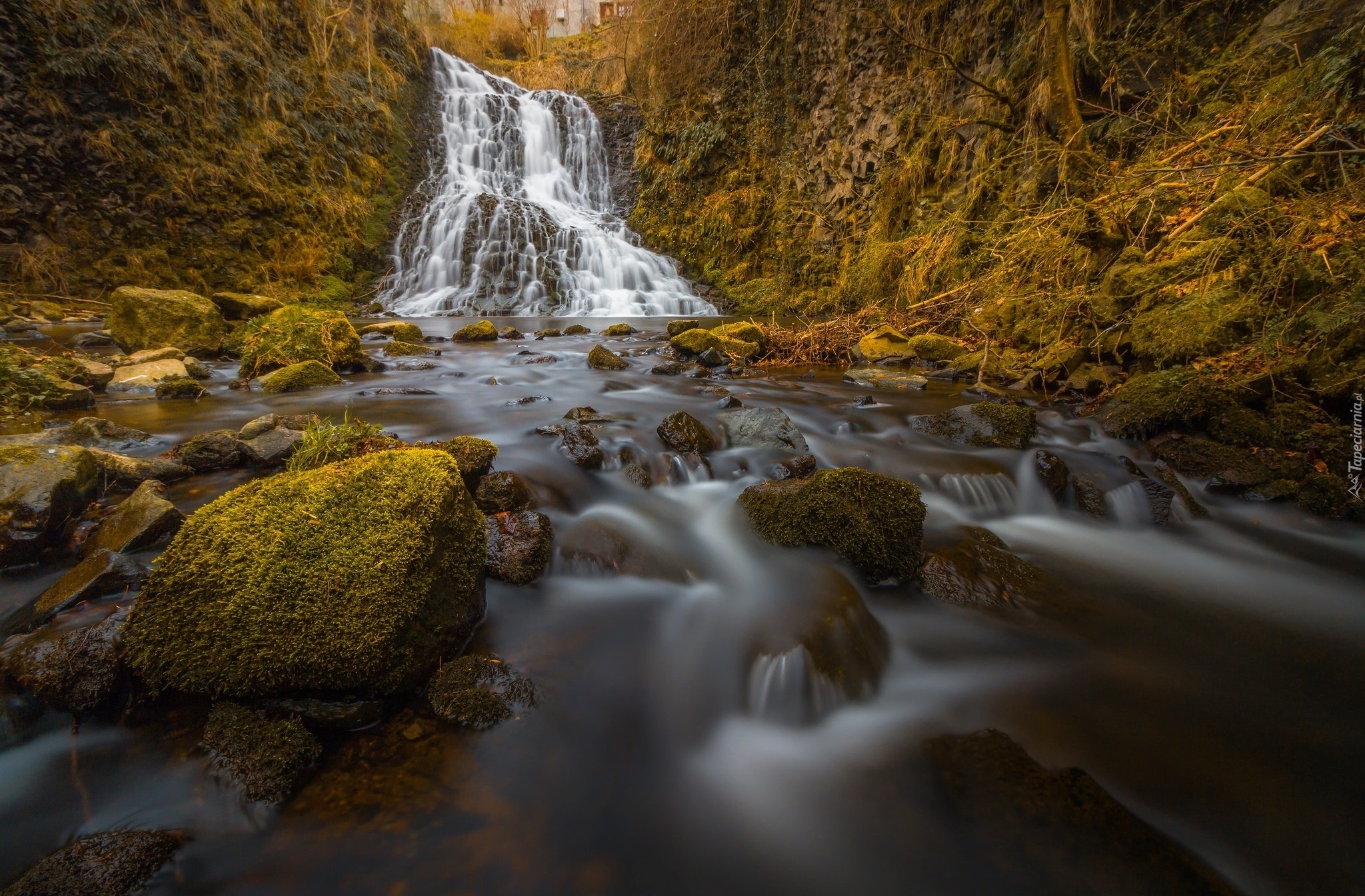 Edytor tapety: Wodospad spływający do rzeki z omszałymi kamieniami