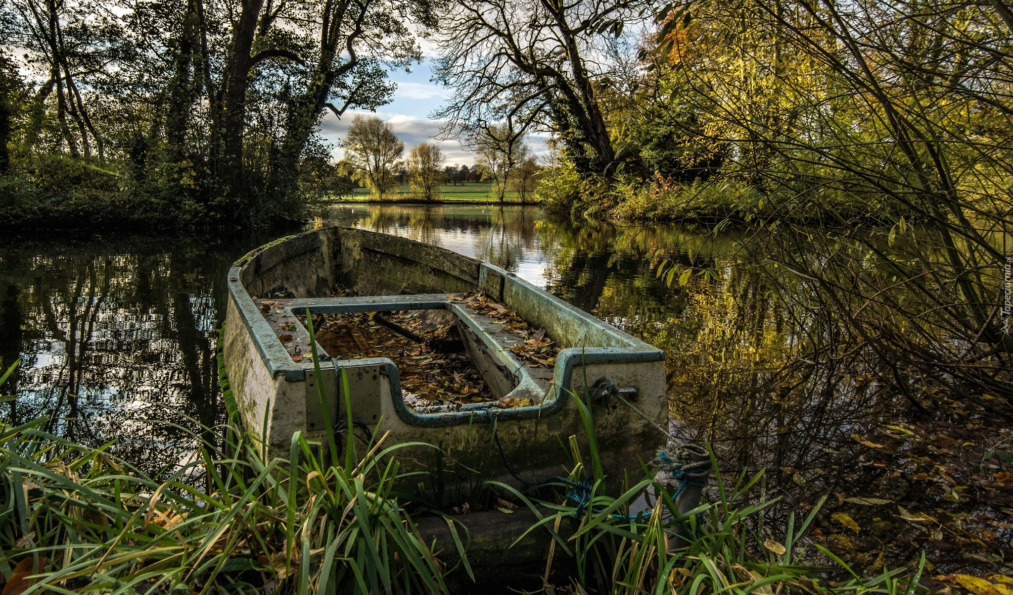 Edytor tapety: Zniszczona łódka w zaroślach nad rzeką
