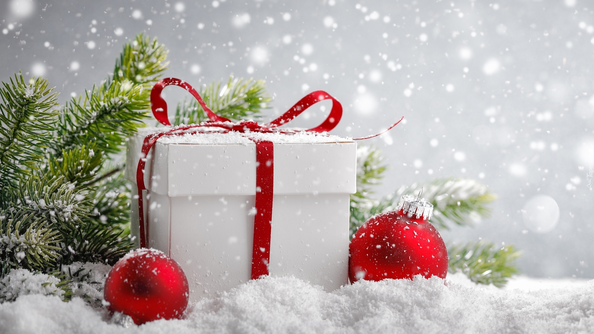 Edytor tapety: Prezent i bombki oprószone śniegiem