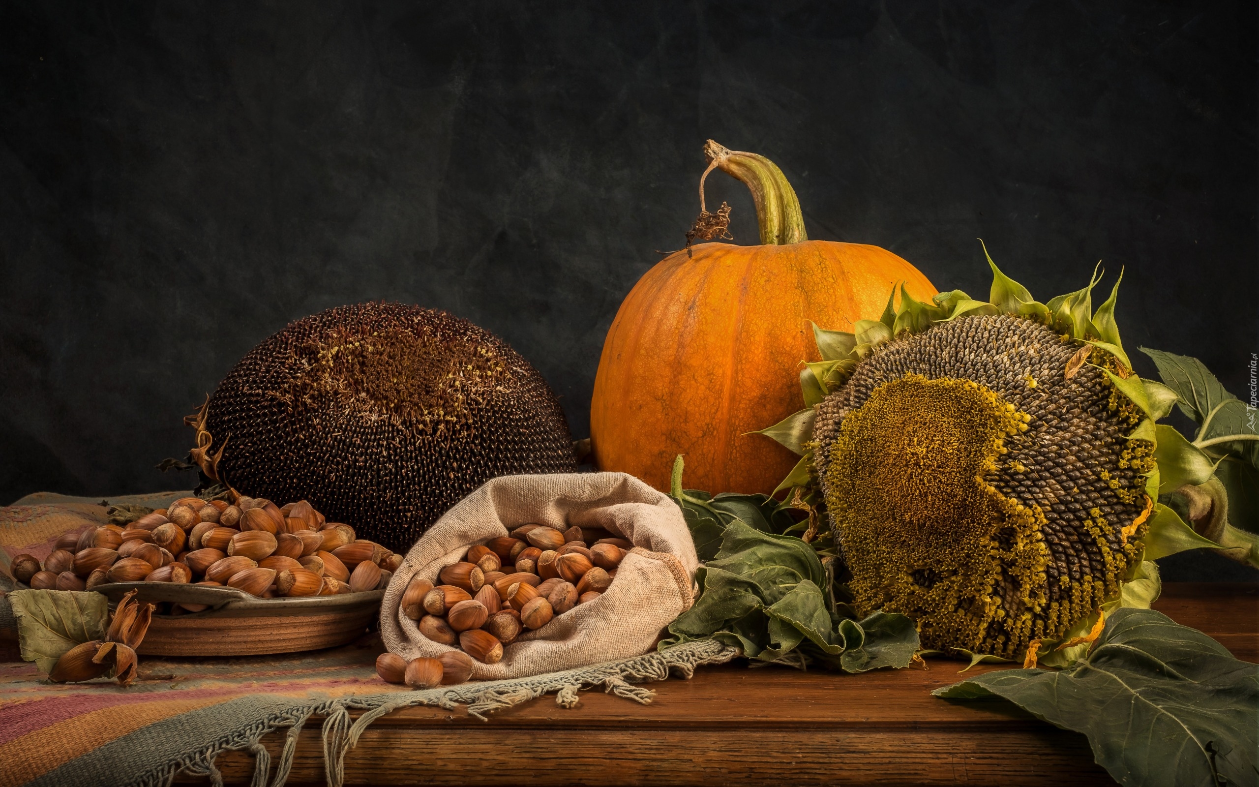 Edytor tapety: Słoneczniki obok dyni i orzechów laskowych