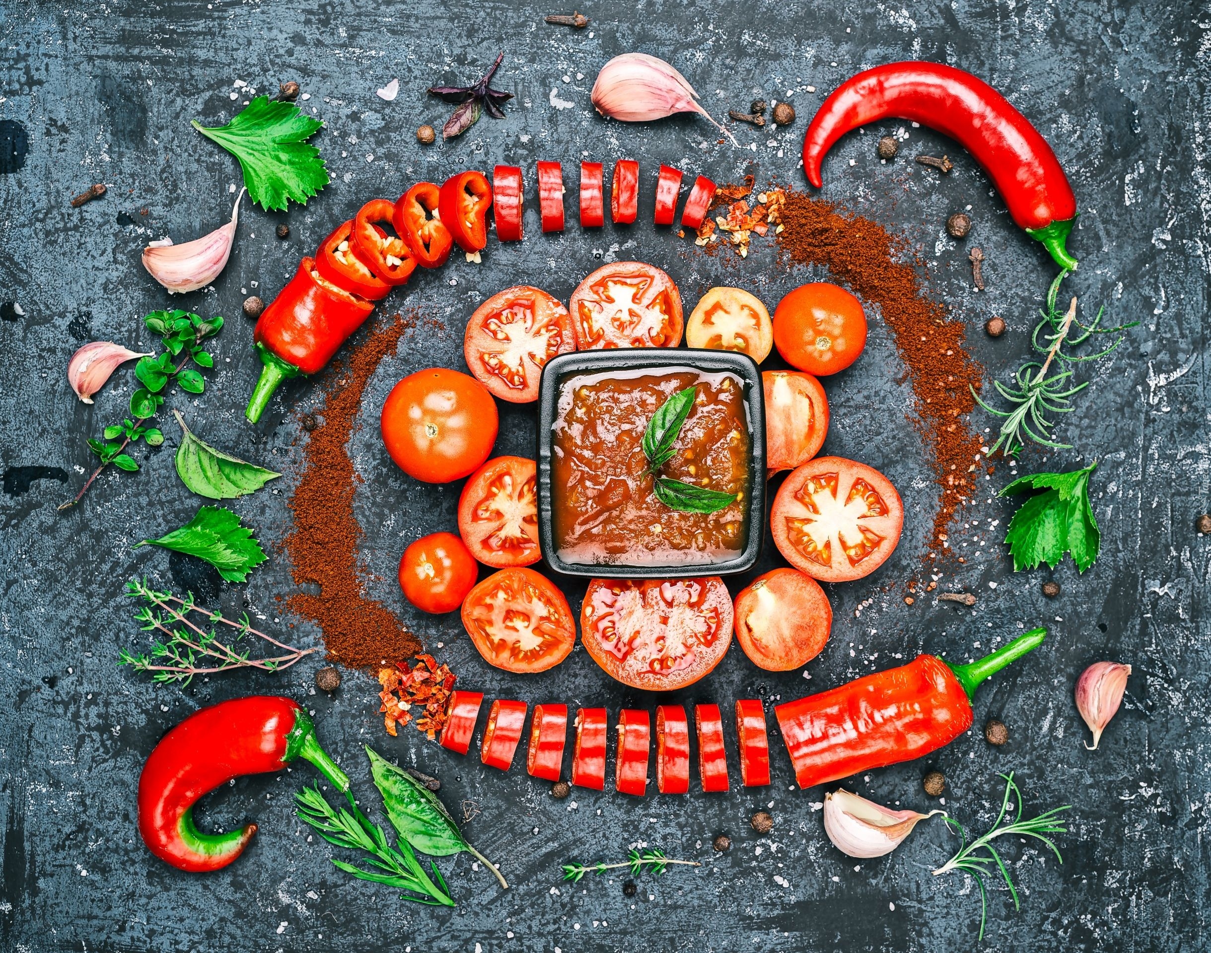 Edytor tapety: Kompozycja z papryki i pomidorów ułożona na deskach