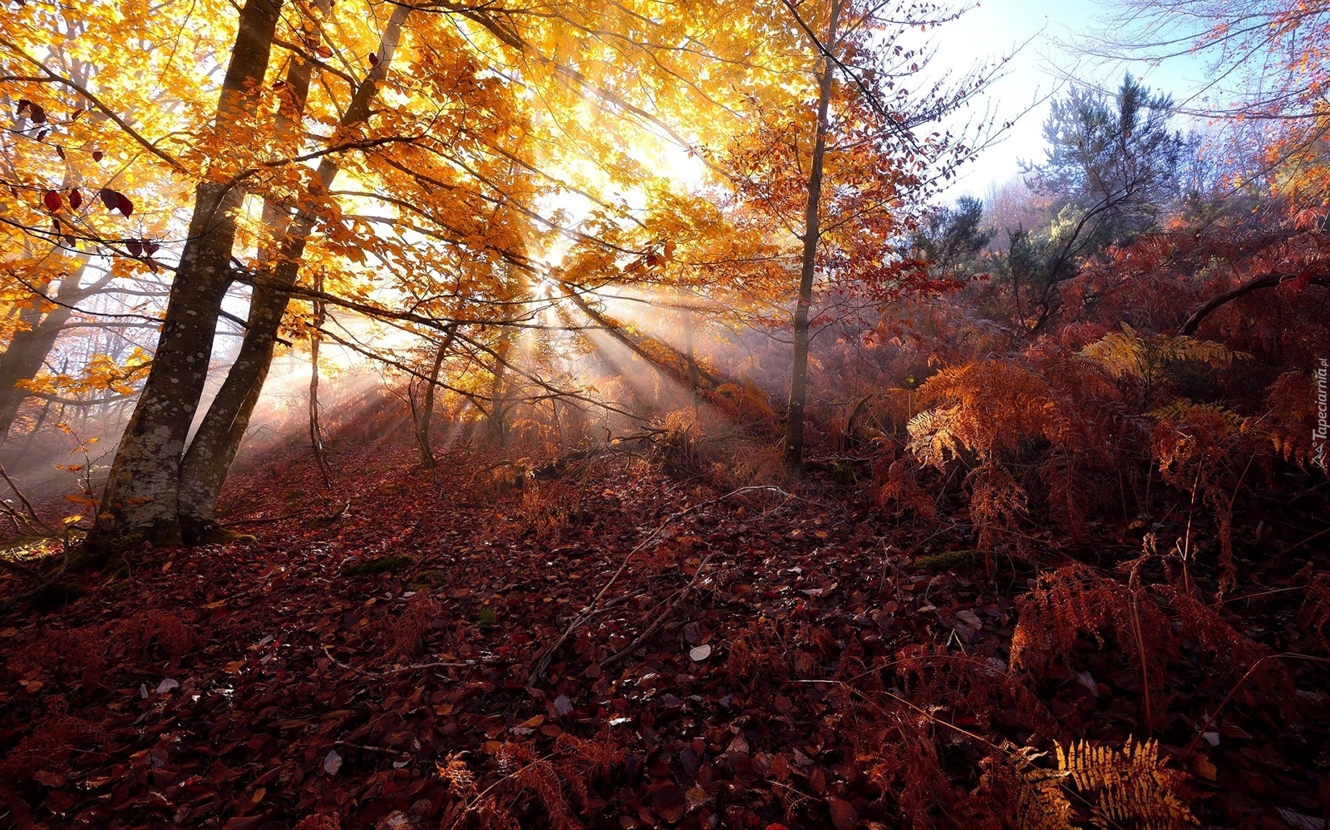 Edytor tapety: Promienie słońca między drzewami padają na paprocie