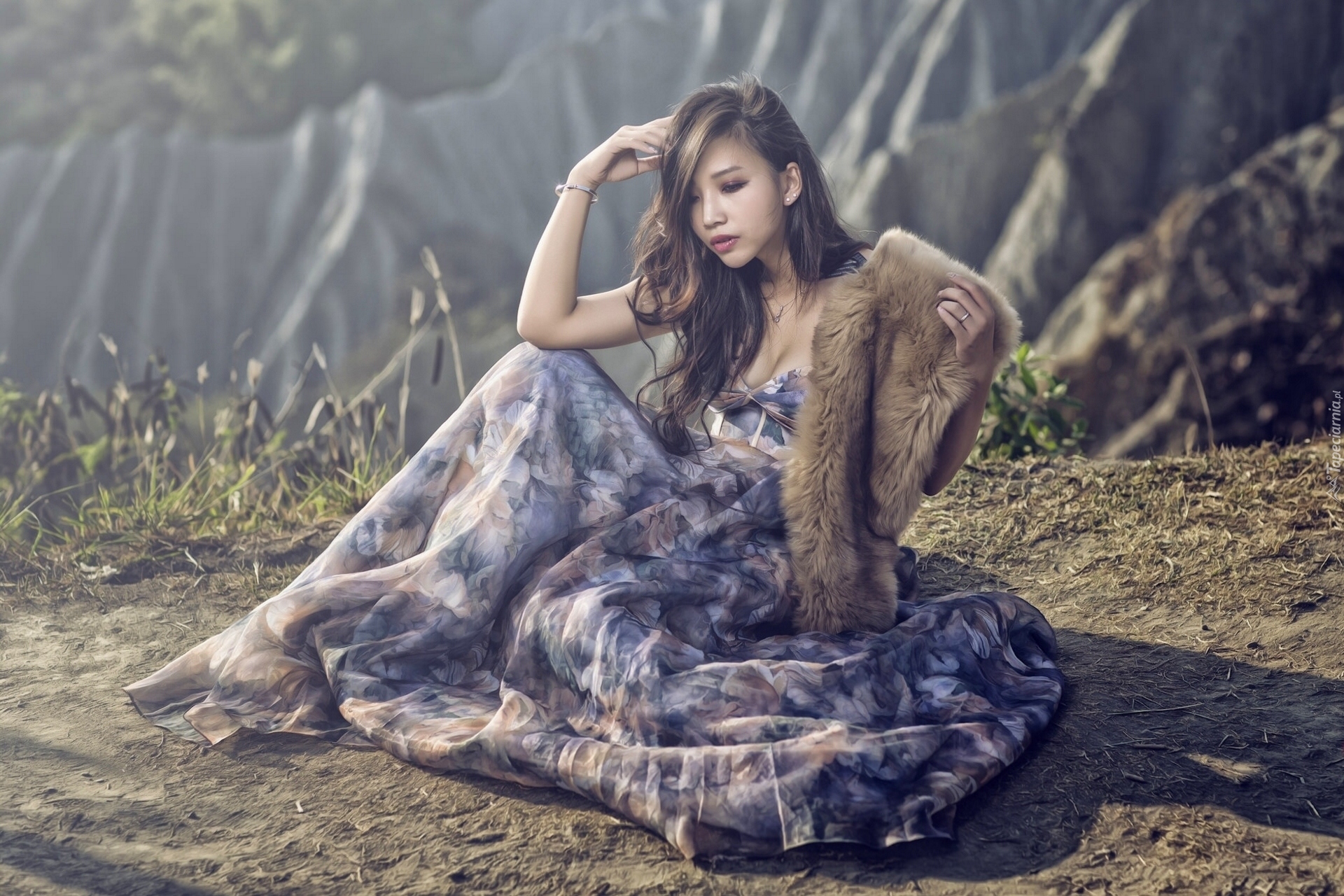 Edytor tapety: Azjatka w zwiewnej sukni z futrem