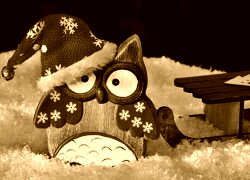 Edytor tapety: Drewniana sowa w czapce Mikołaja z saniami na śniegu