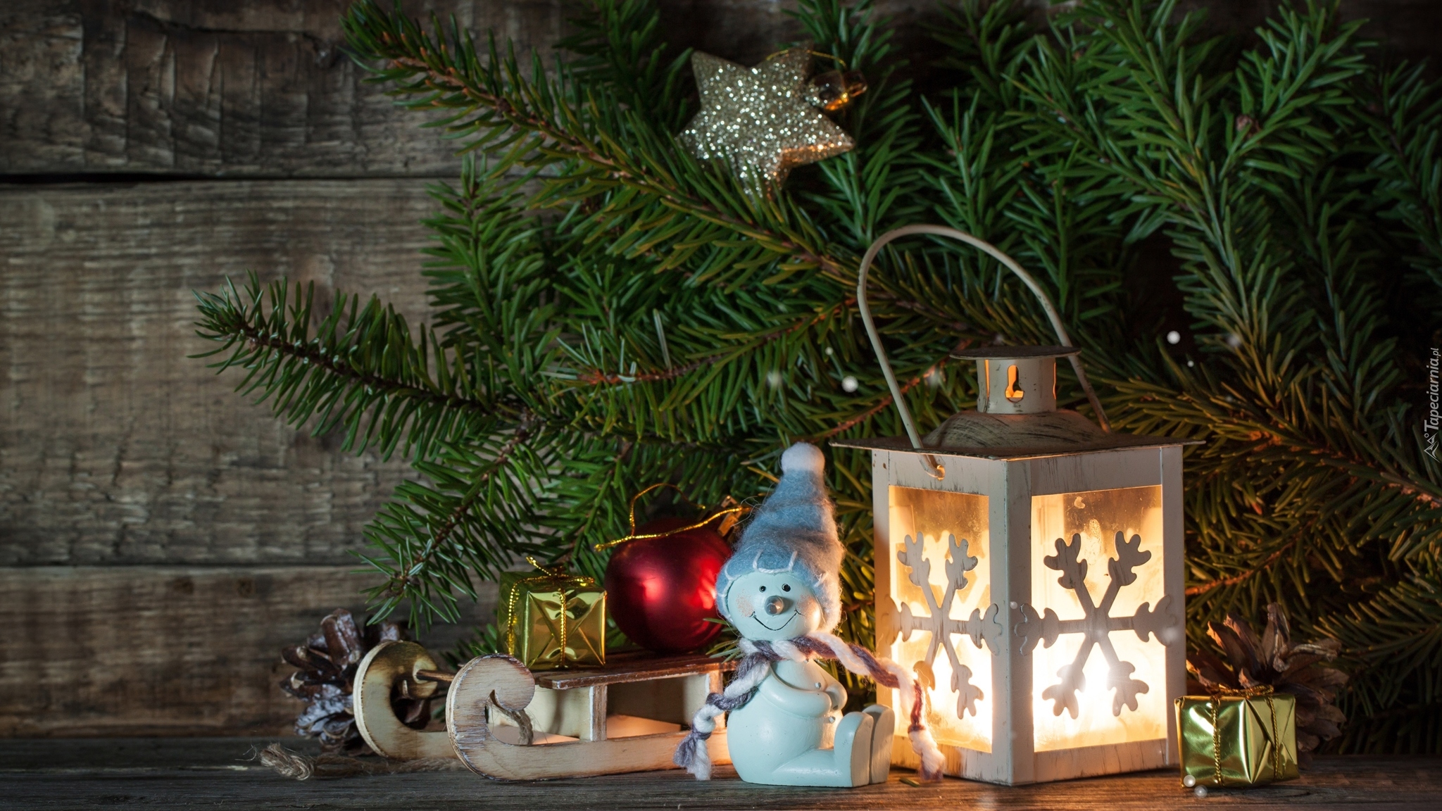 Edytor tapety: Bałwanek obok lampionu w świątecznej dekoracji