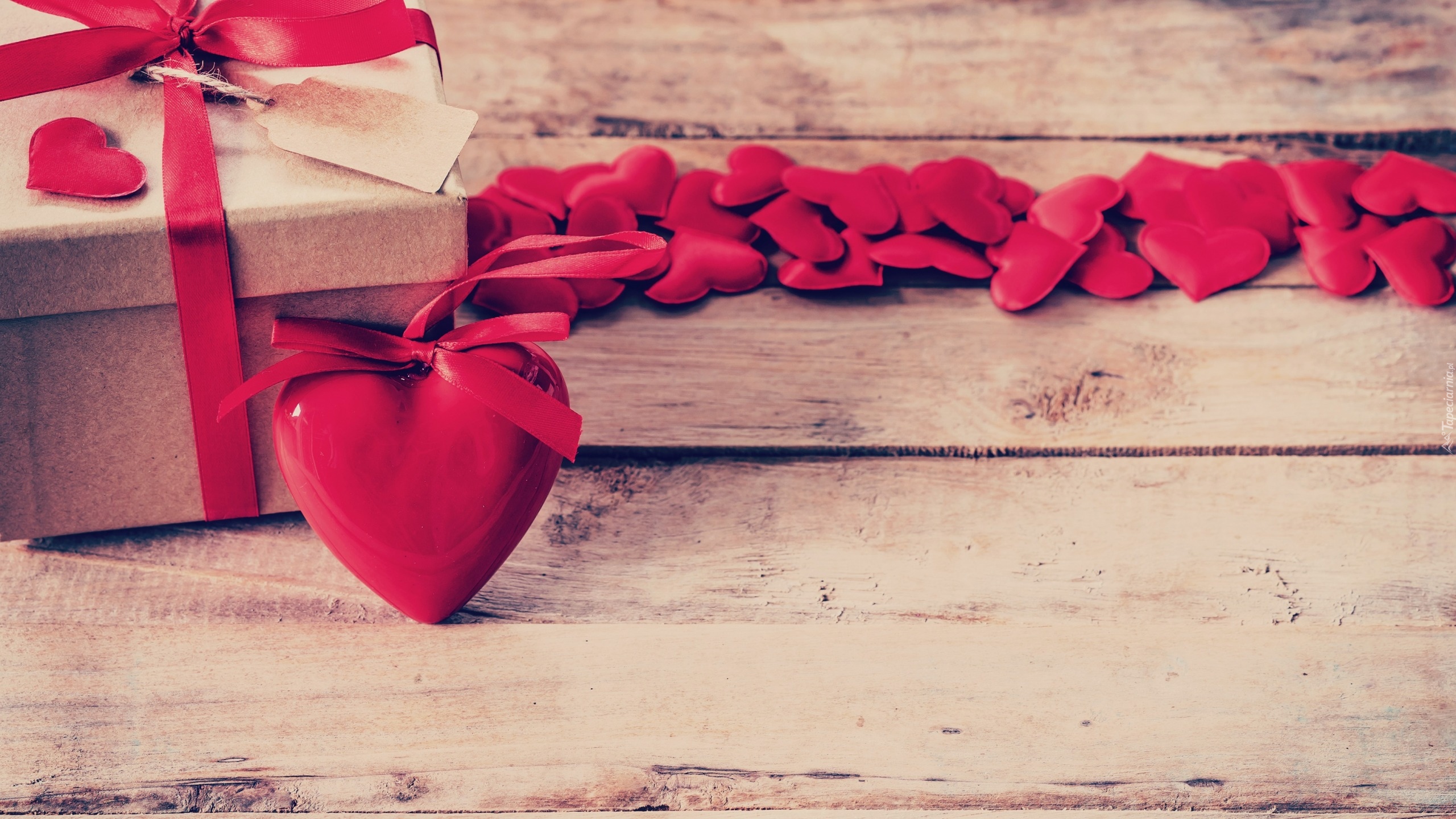 Edytor tapety: Serce oparte o pudełko z prezentem przewiązane wstążką