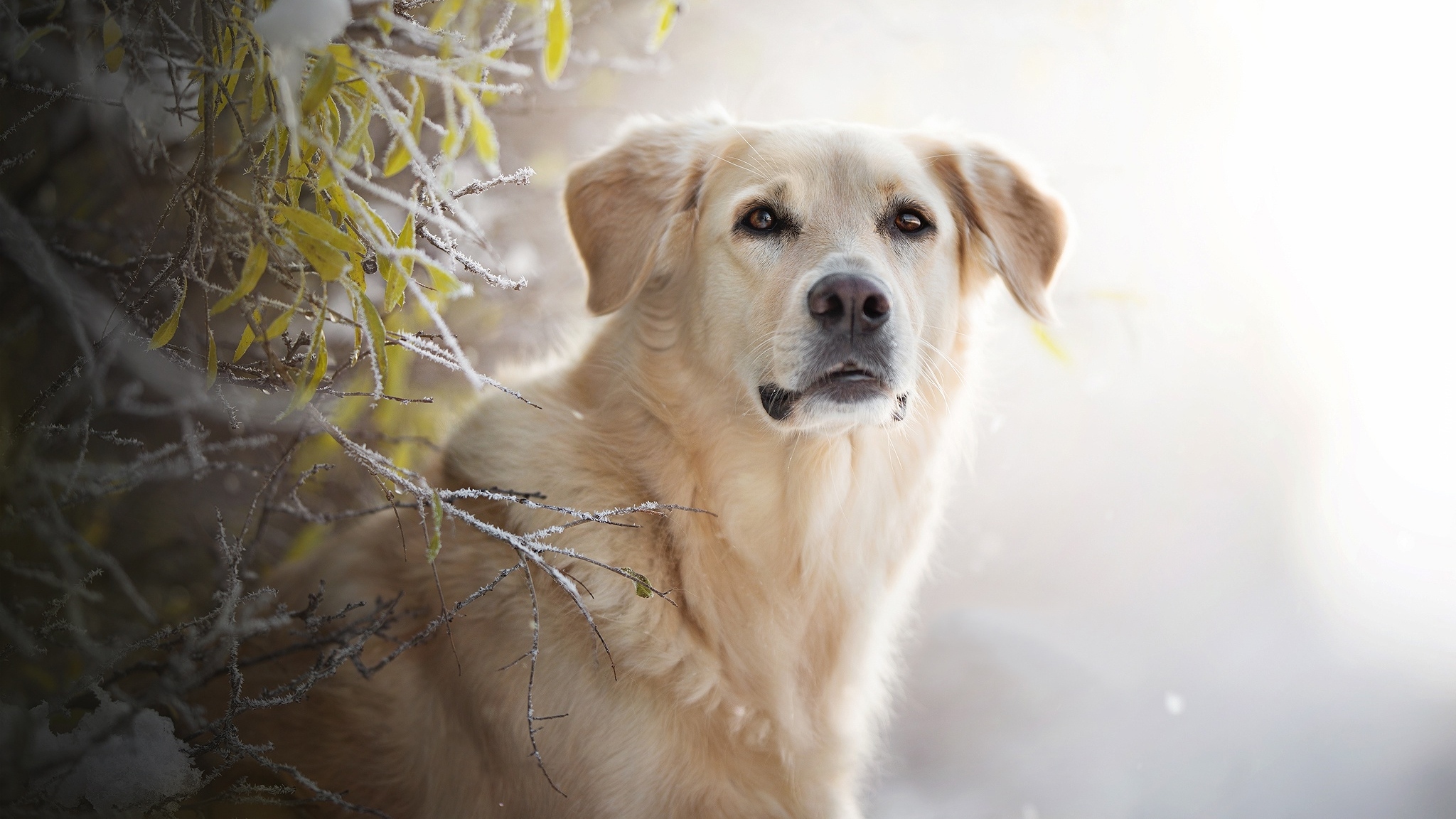 Edytor tapety: Golden retriever obok oszronionych gałązek