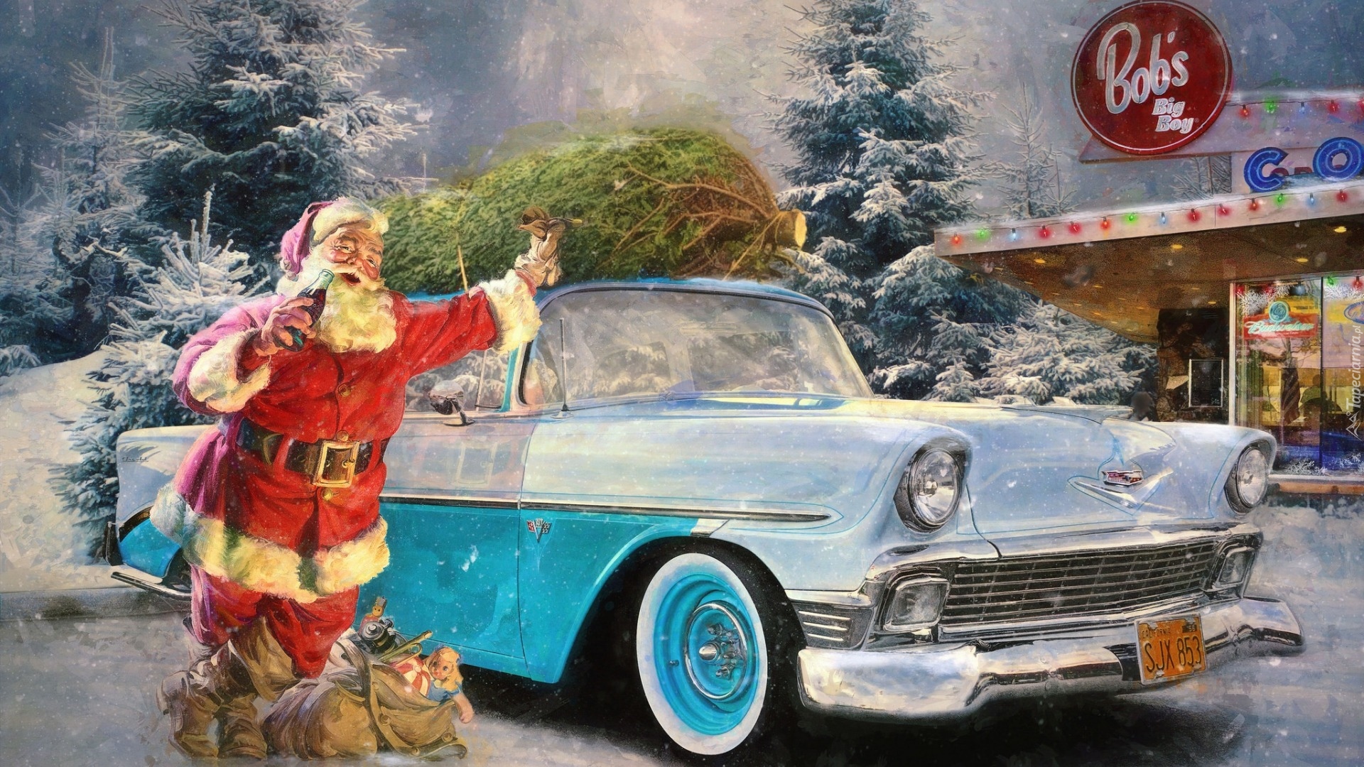 Edytor tapety: Mikołaj obok worka prezentów oparty o samochód