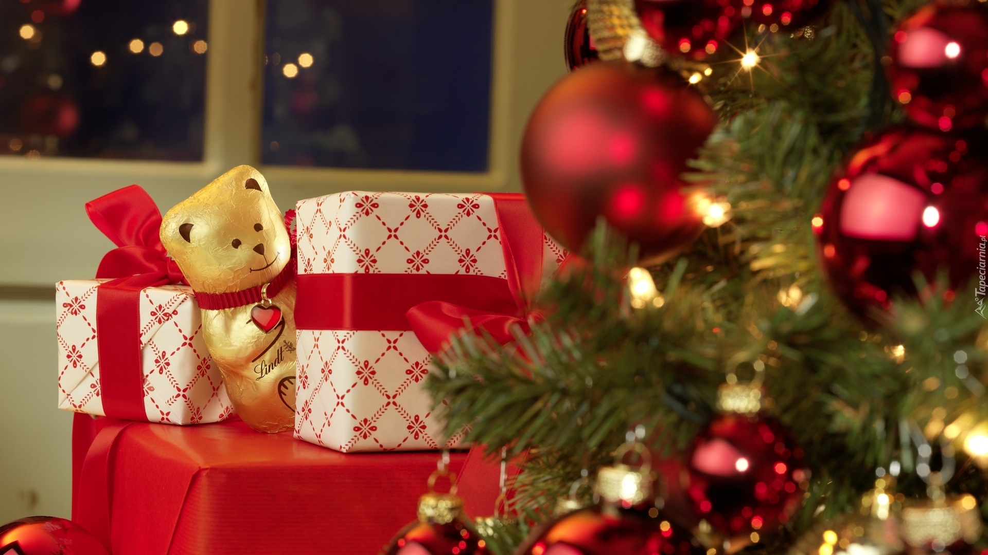 Edytor tapety: Czekoladowy miś między prezentami obok choinki