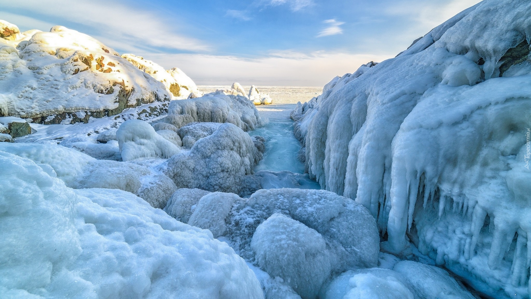 Edytor tapety: Oblodzone skały na brzegu morza