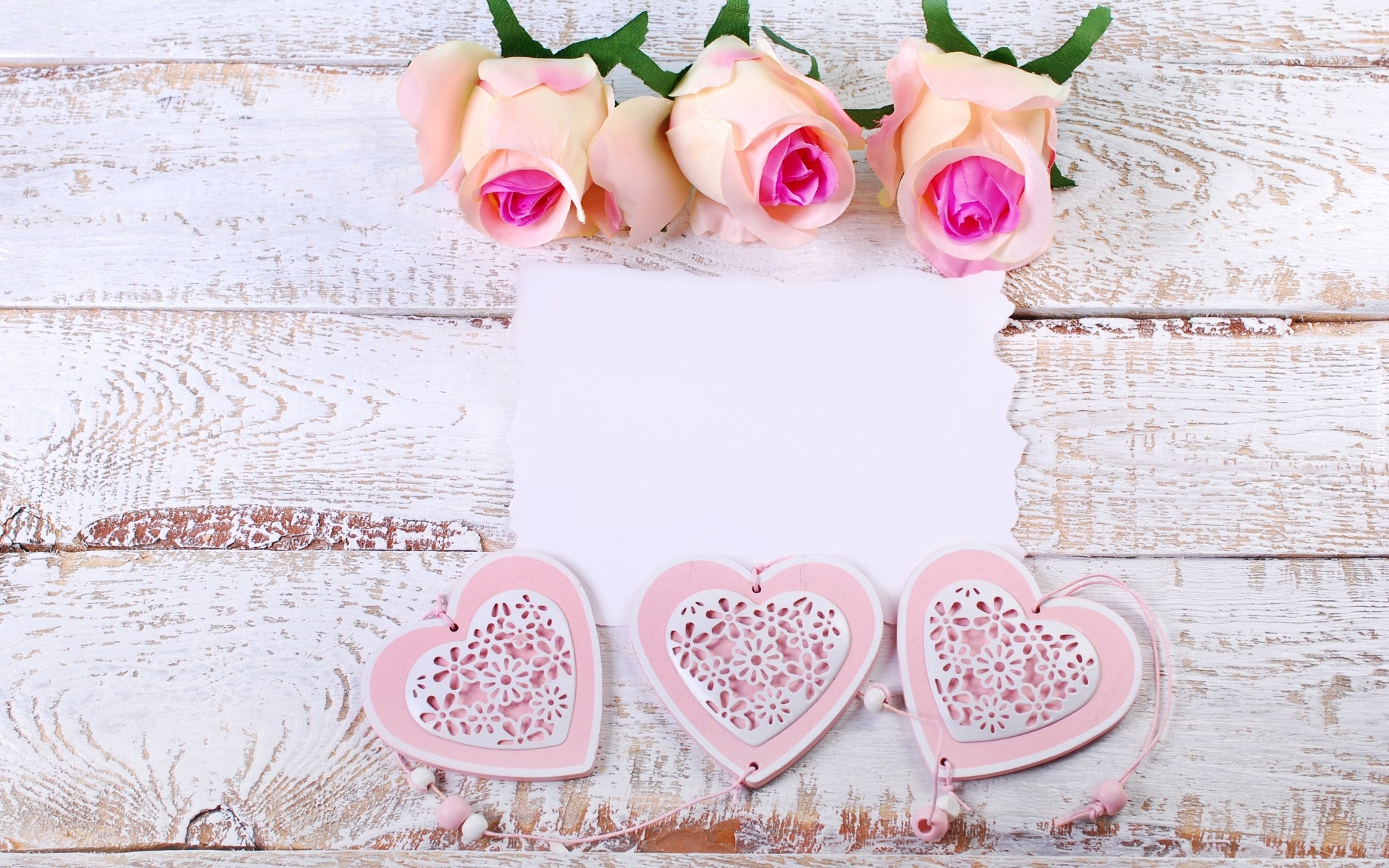 Edytor tapety: Róże i serduszka obok pustej kartki na deskach