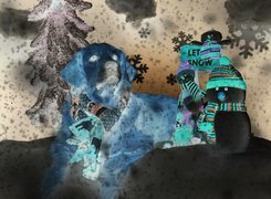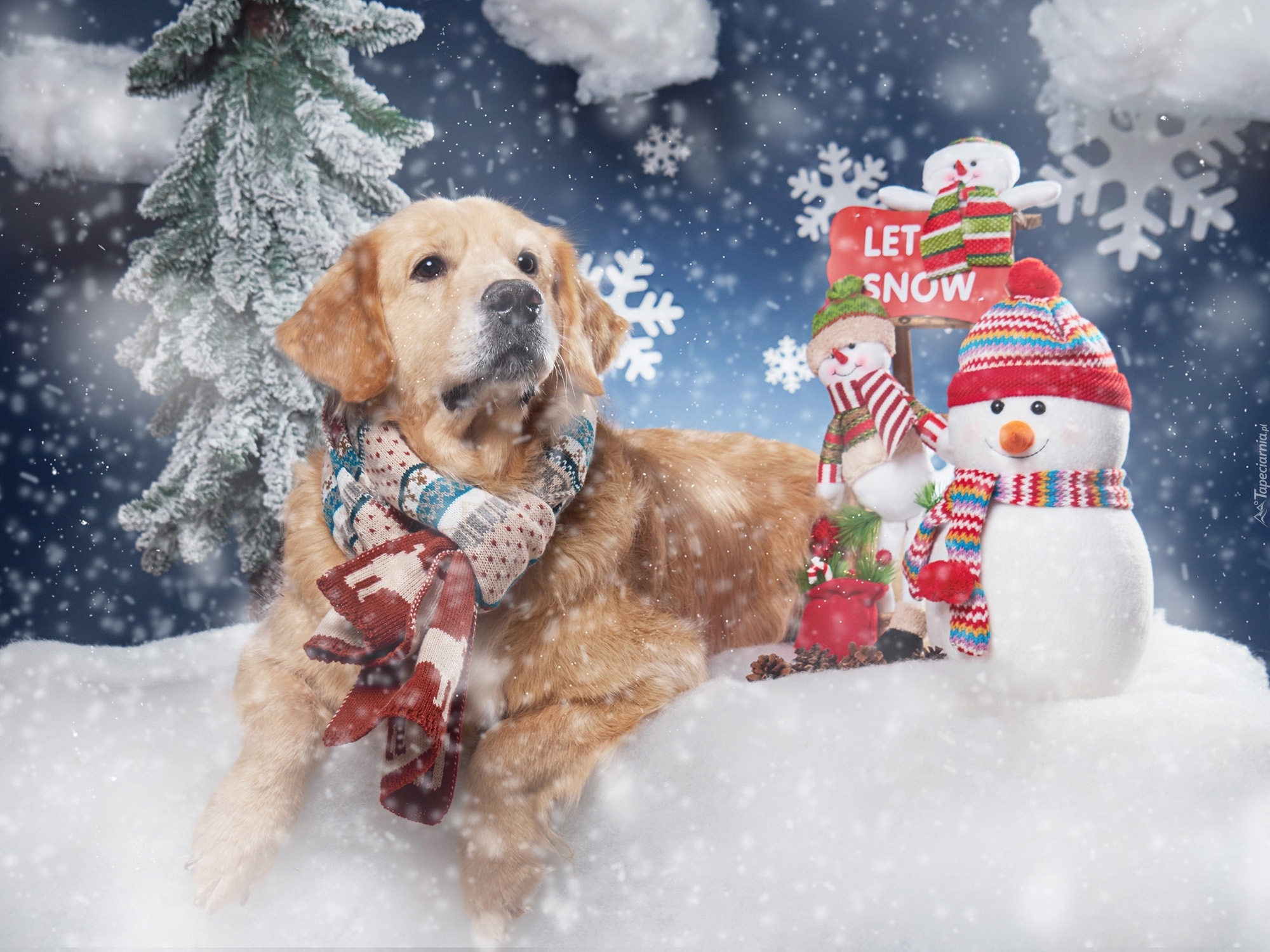 Edytor tapety: Golden retriever i bałwanki na śniegu