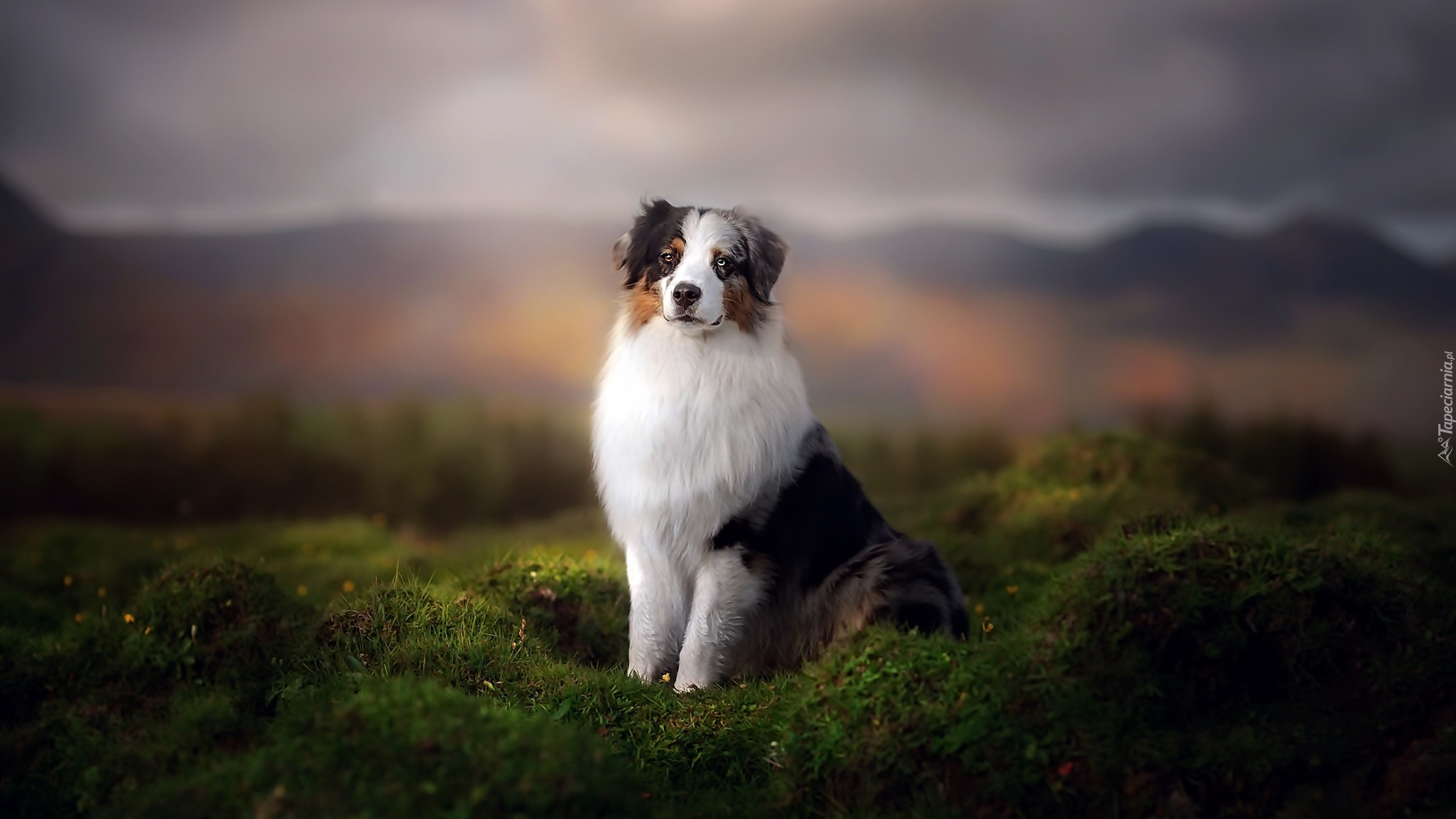 Edytor tapety: Owczarek australijski pozuje na tle zamglonych gór