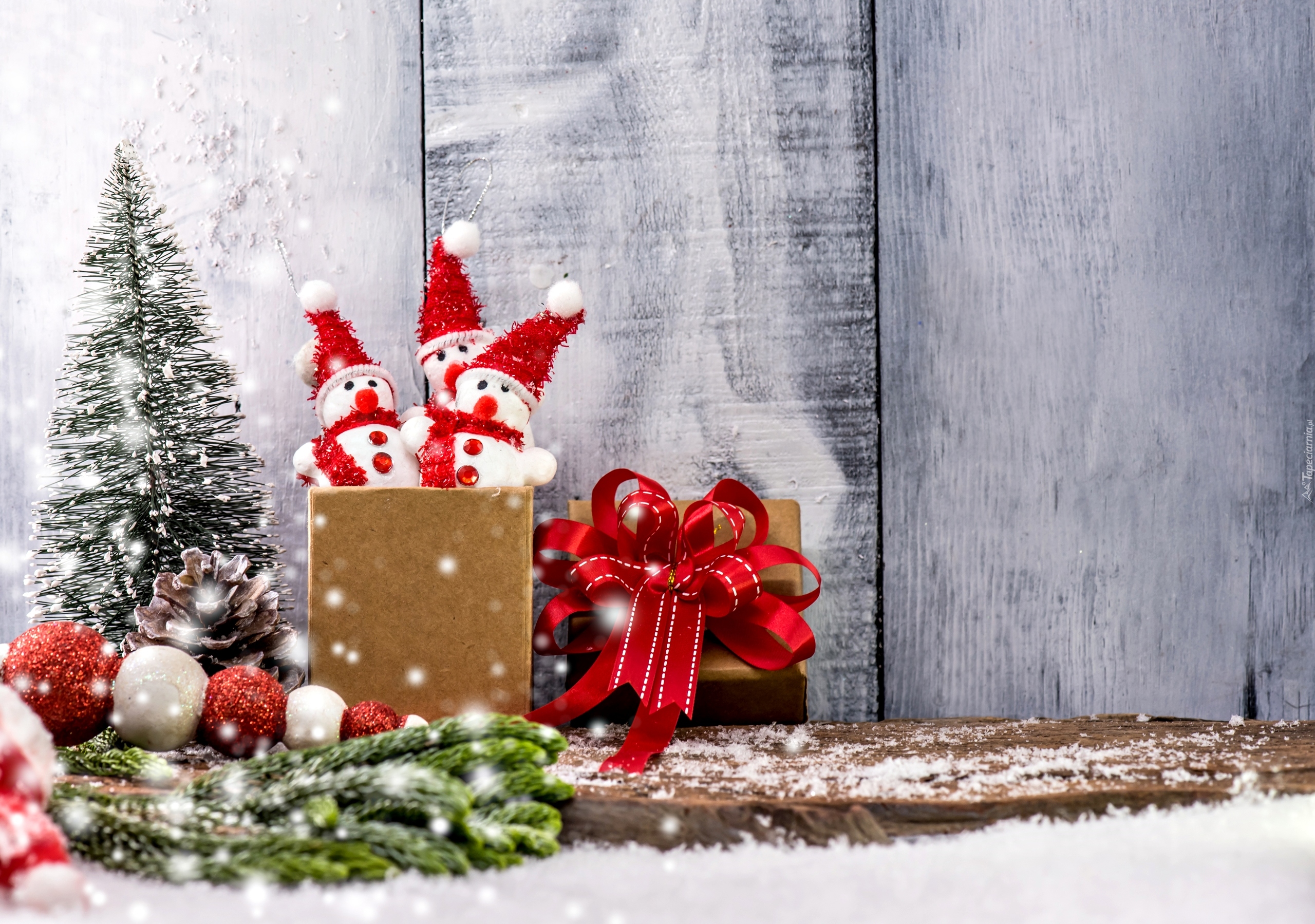 Edytor tapety: Bałwanki w pudle obok choinki i prezentu